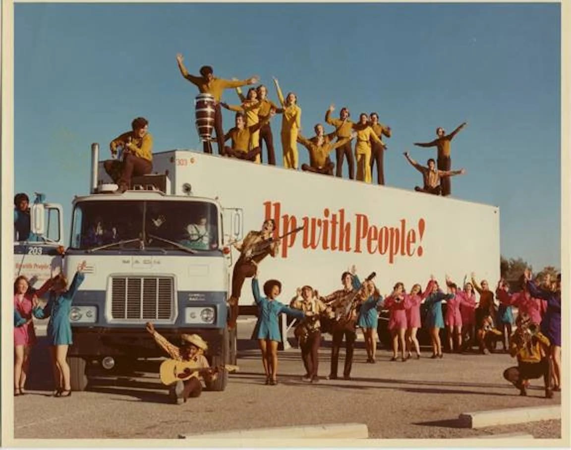 A 2016 New York Times story described the mid-70s transition from marching bands to Up With People this way: “Brass instruments gave way to turtlenecks and awkward dancing for a performance saluting the nation’s bicentennial, delivered by the educational group Up With People, who preached unity and progress.”
