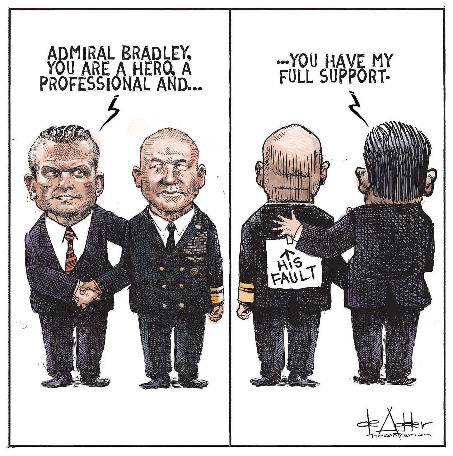 Yes! You can count on Hegseth to always have the admiral's "back" in exactly this way! A two-timing backstabber, to be sure! Great cartoon!! A picture really is worth, in this case, thousands of words!!