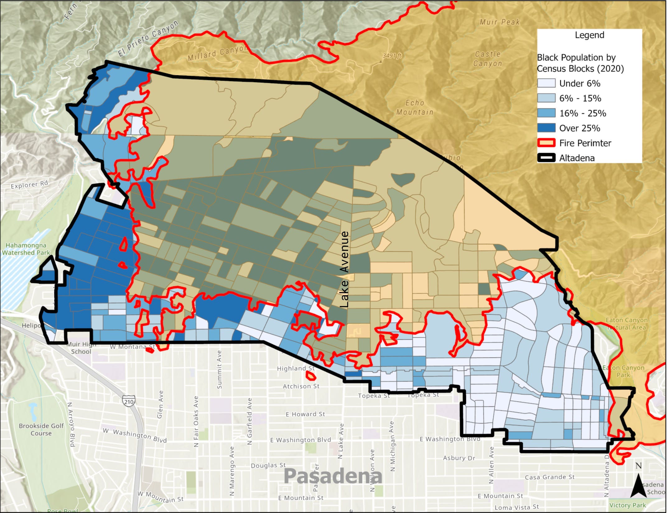 Echoing the historic redlining, there is a distinct line in the sand (down central Lake Avenue) that persists to this day, east of which Altadena becomes notably whiter and wealthier. Though the fire started in the east, wind patterns caused the fire to tear through western Altadena unabated. Yet residents of the area were not issued evacuation orders until 3am, nearly ten hours after orders were given for the east. And because of the fire raging in the Palisades, firefighting resources across Altadena were limited. In the end, 18 of the 19 individuals who perished in the Eaton Fire were from western Altadena. 48% of Black households were destroyed compared to 37% for non-Black households. The impact was disproportionate.