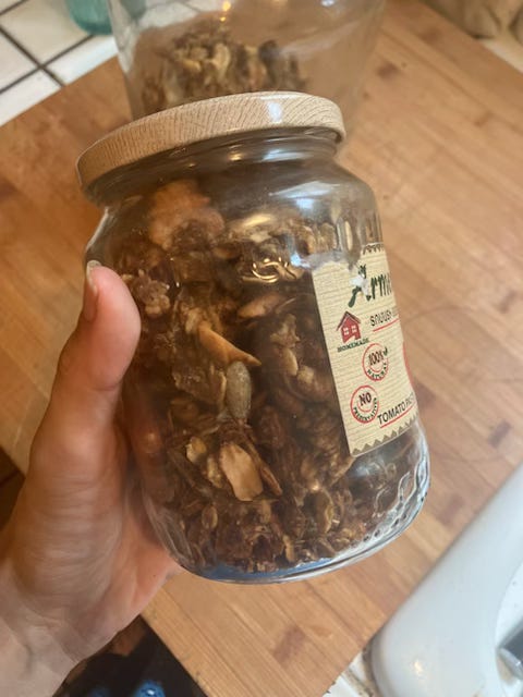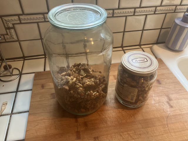 I started sharing granola with my neighbors as part of my resolution to be better about community building, and, to be honest, to have a solution for my irredeemable glass jar hoarding habit (the flower arranging party was also great for this, if you, too, are looking for a solution). Every time I make a big batch of granola for my family, I simply fill up an extra glass jar or two and spread the love. I’ve brought thank you jars to parties, dropped them off at neighbor’s houses, shared with the friend who invited my toddler and me to her house for a mental health break.