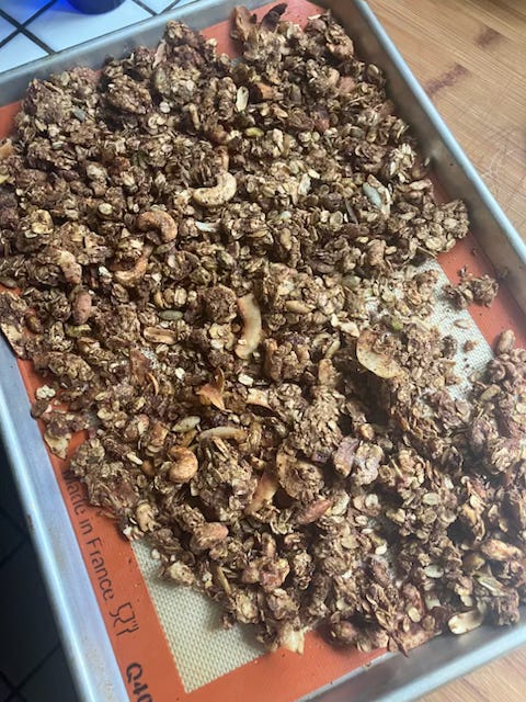Bake for 20 minutes before giving everything a good stir. Slide back into the oven for another 20 to 30 minutes, stirring periodically. Once everything looks nice and toastyl, turn off your oven and let it come to room temperature, propping the door open with a wooden spoon if you’re worried about things burning.