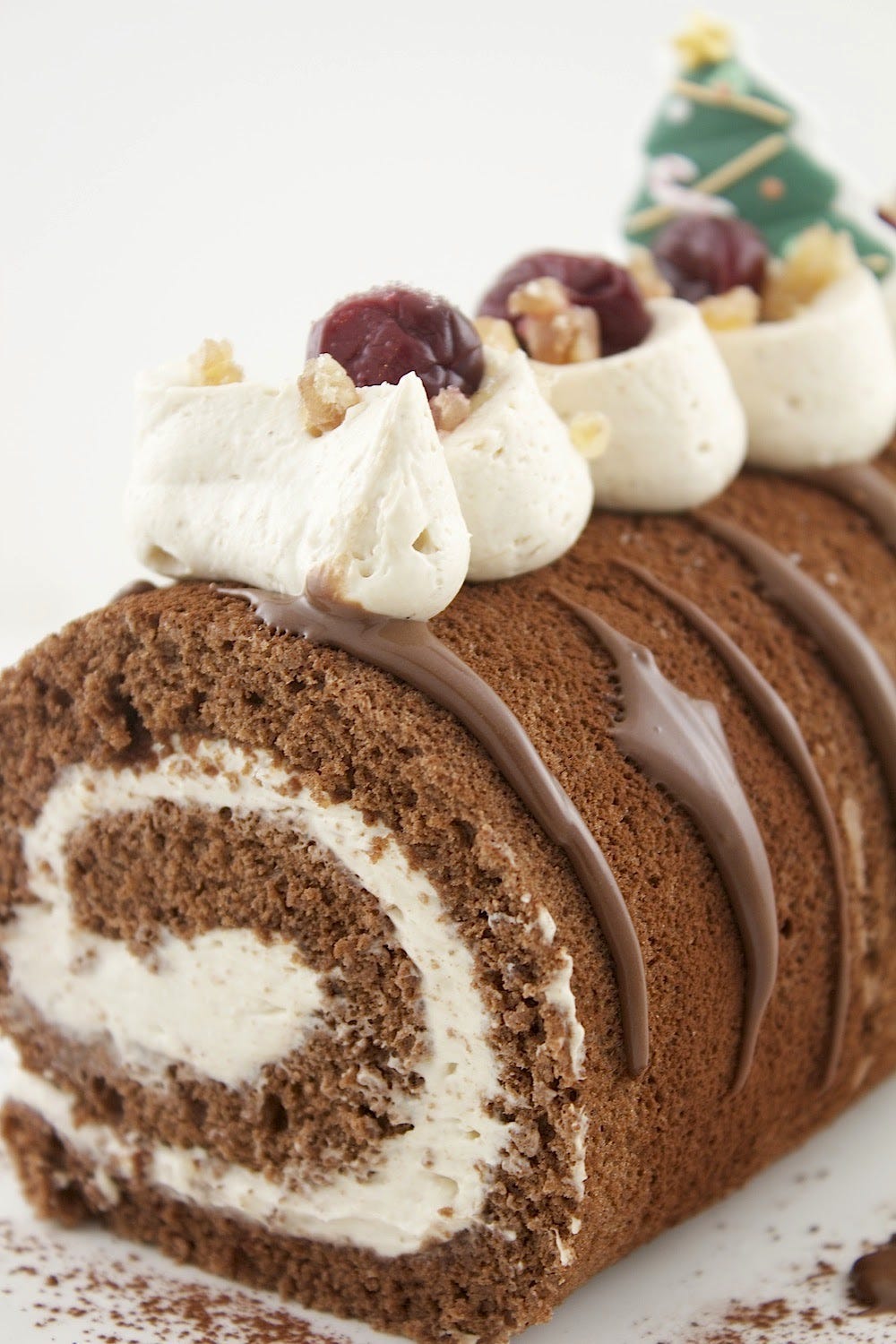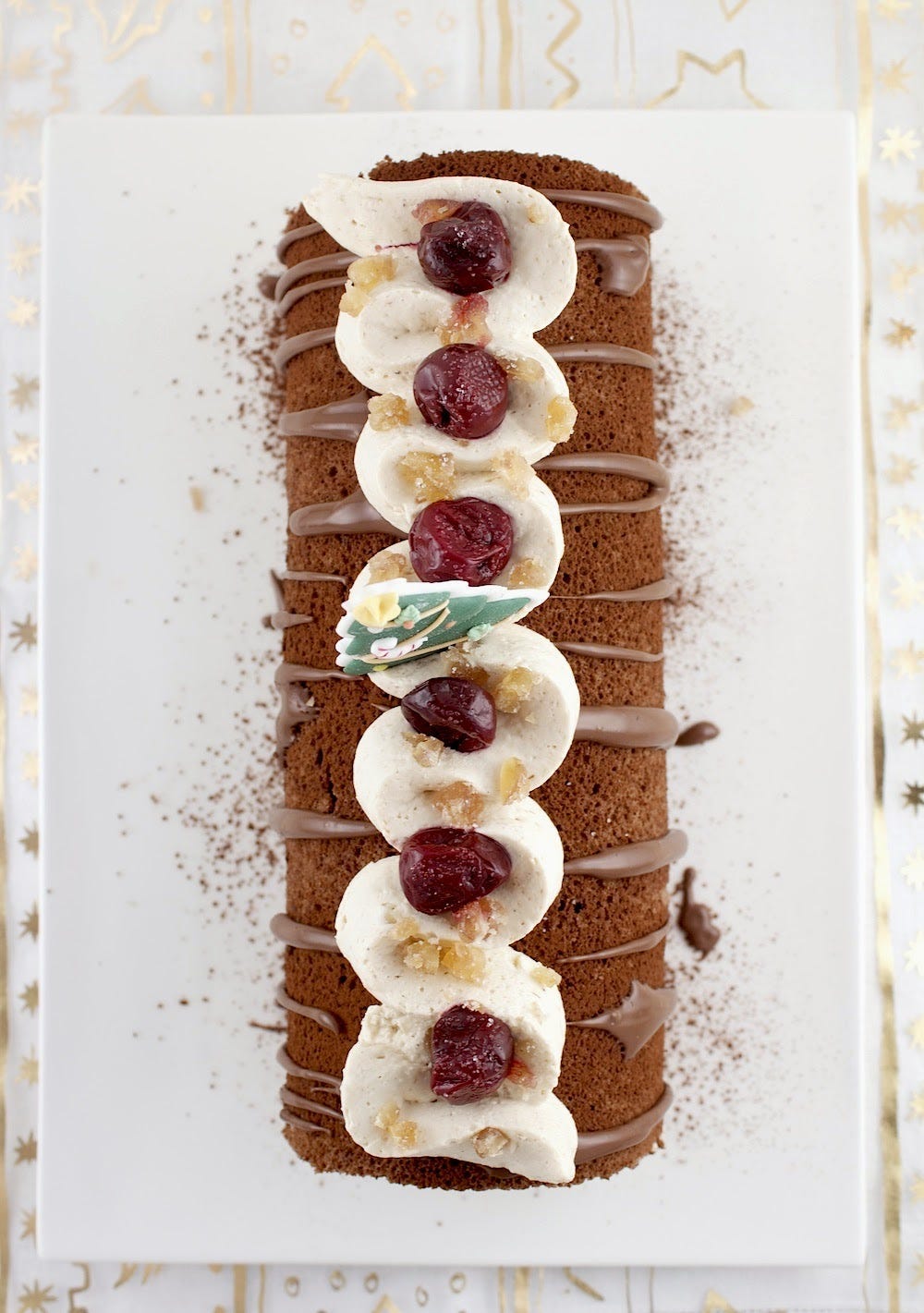 Just before serving, dust the entire surface of the roll lightly and evenly with cocoa powder or powdered/icing sugar, drizzle with chocolate rum ganache then pipe the rest of the cream on top and decorate as you like with fruit, colored sugar, crushed candy canes or chocolate curls. Or candy Christmas shapes. I used chopped candied chestnuts.