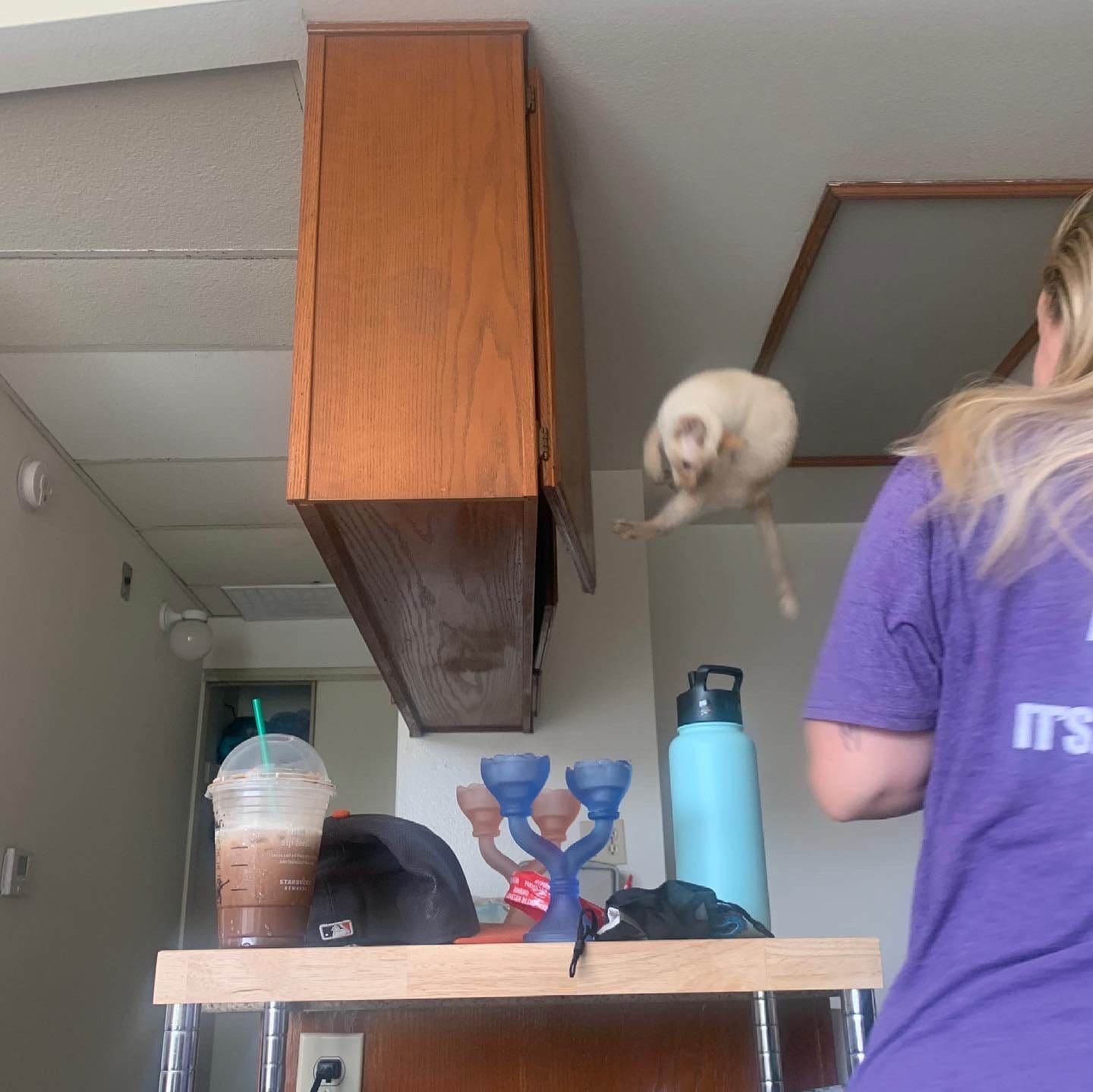 Love the name. In her worst moment, was she jumping up or down? If down, out of the cabinet? How'd she get up there?