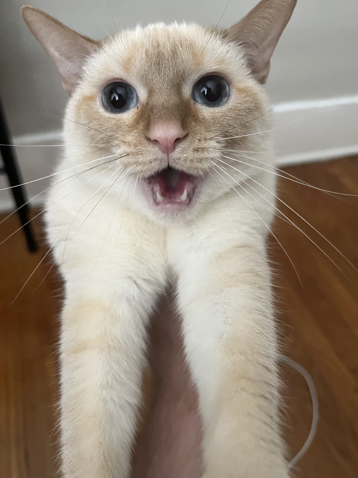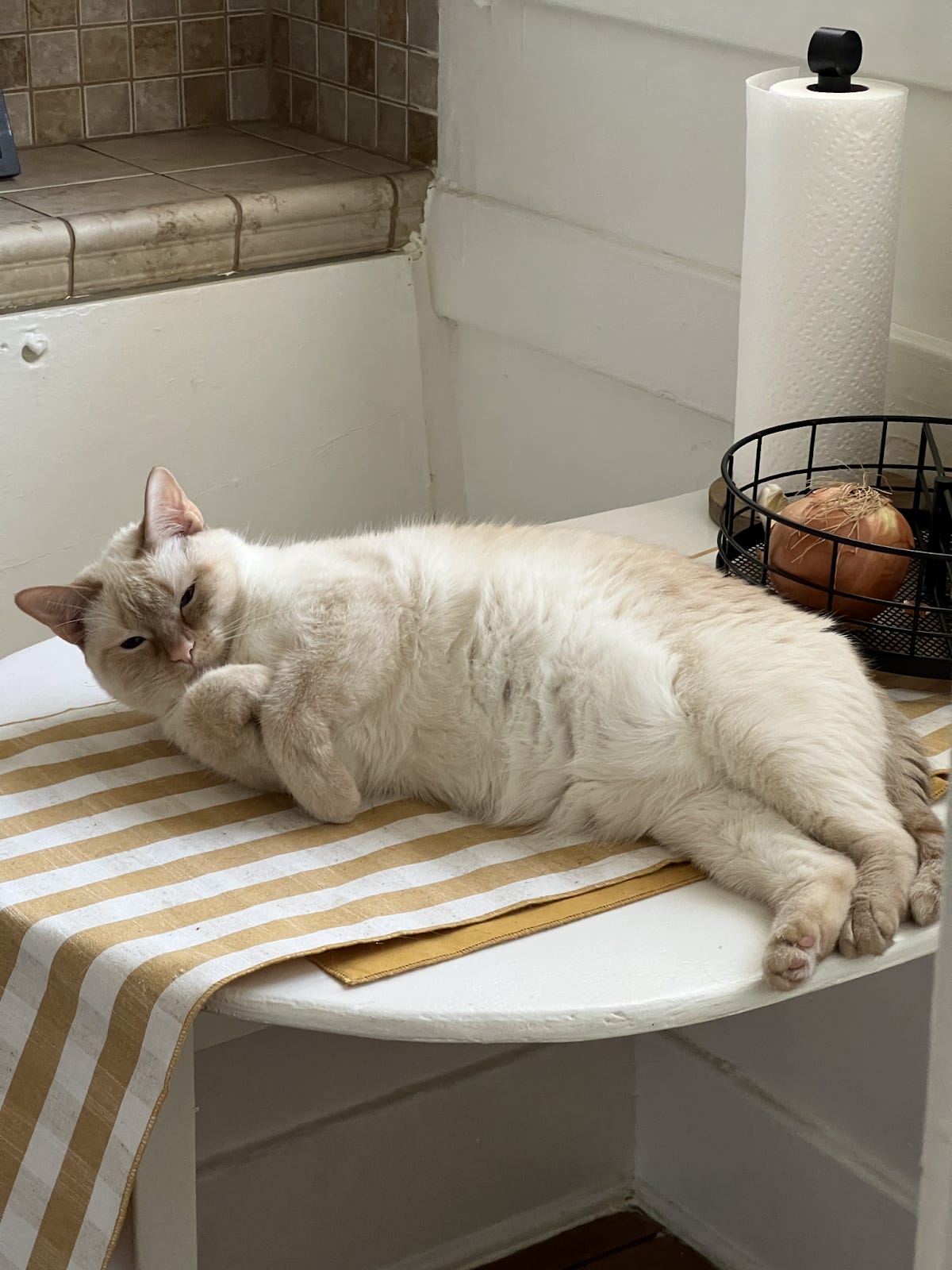 I have two Siamese, Ariel and Zelda, and they are special and they know it. They are the elite of the kitty kingdom and do not hesitate to let you know. I adore them both. Fettuccine is another cream princess. What a cutie.