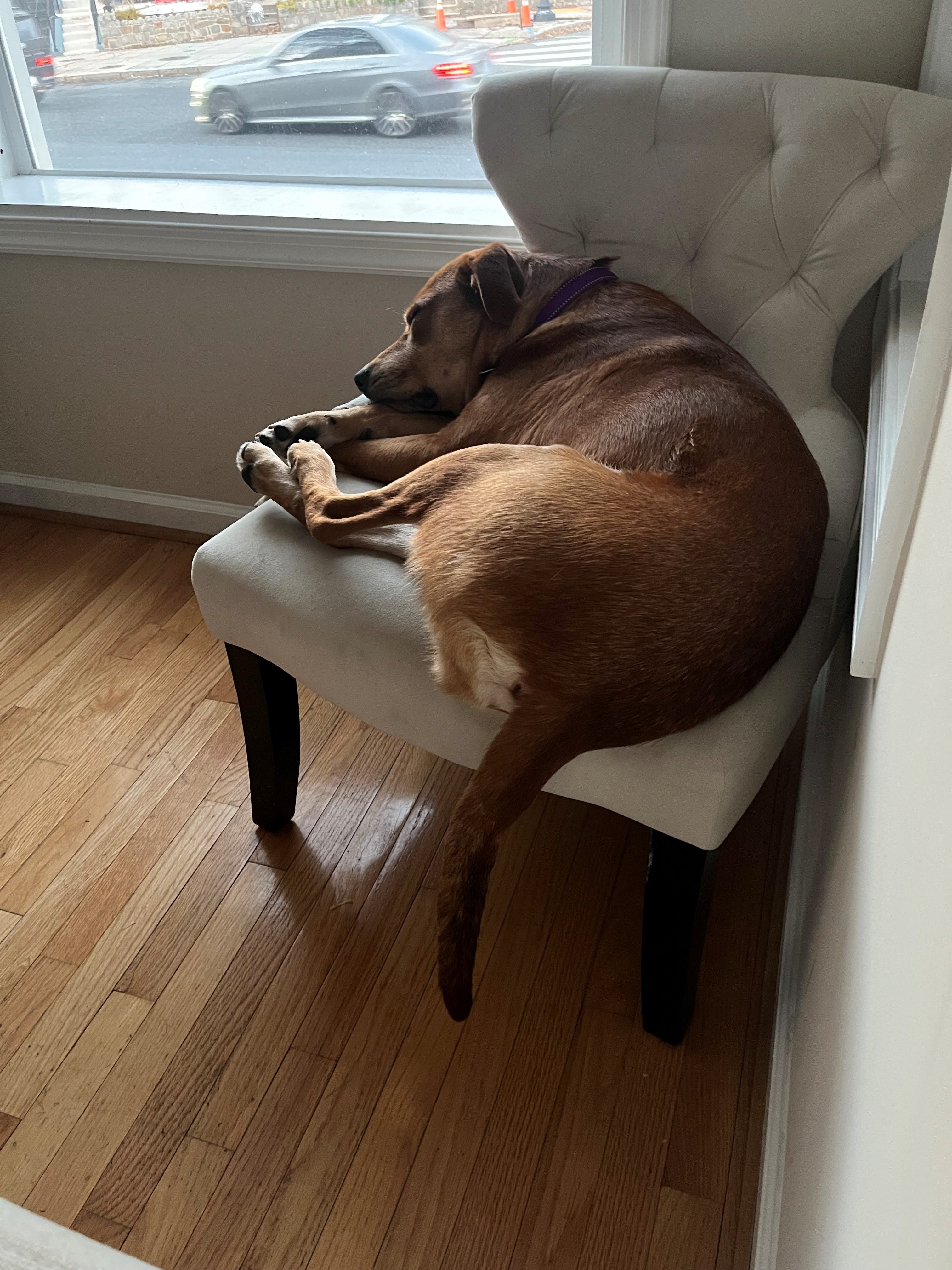 Hobbies: Bouncing around (literally) at the dog park, curling up on chairs that he’s 20 pounds too big for, letting out a decent howl when he’s happy, invading personal space.