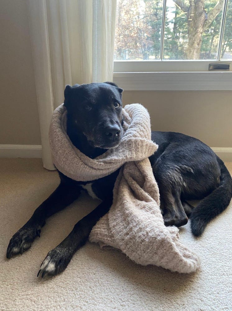 What a sweetie. Looks like my sisters ( and my doggie niece) Olive who is a black borador. Border collie and lab mix. Shelter pup who is two. Black dogs are the best!!!!!!!