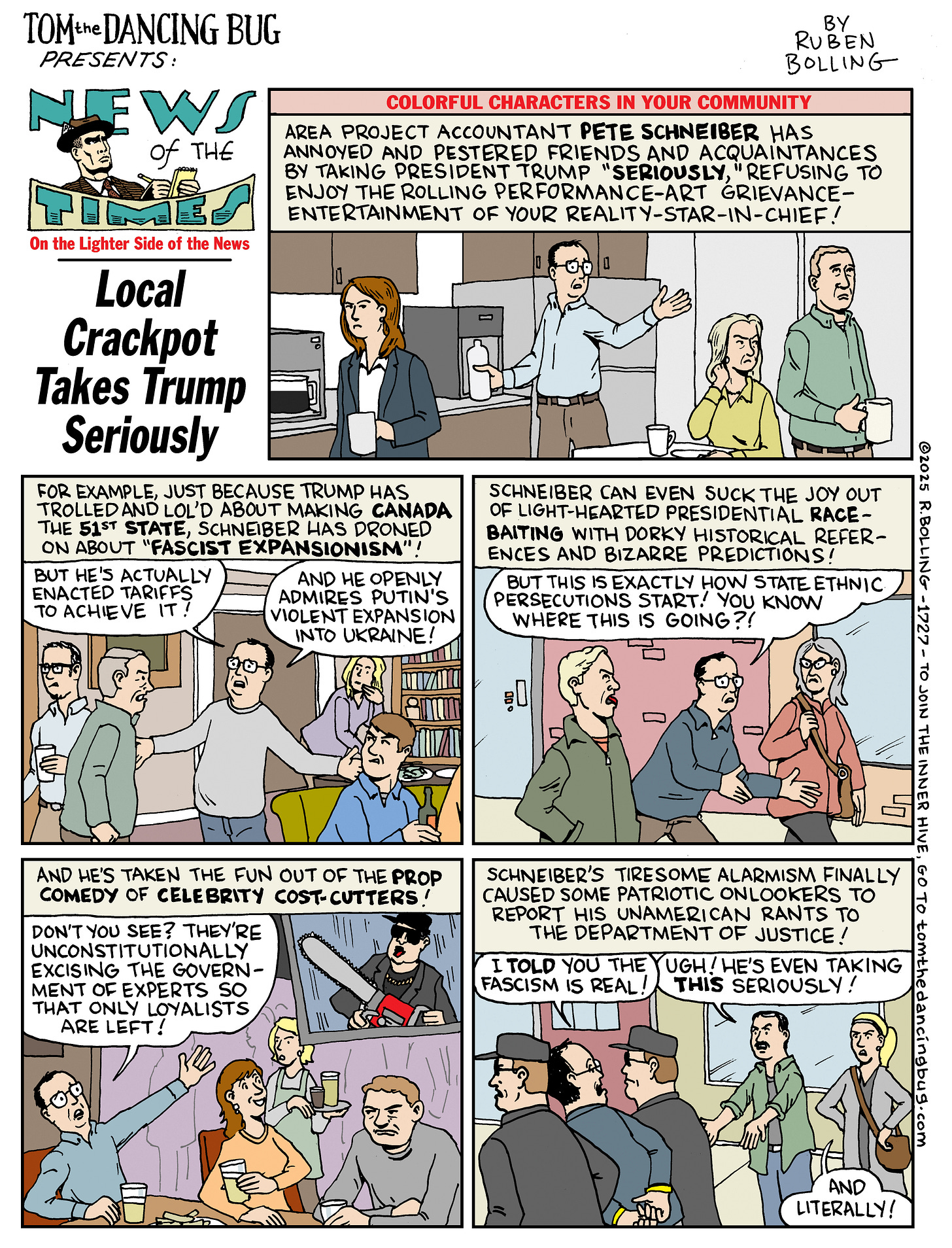Follow Ruben Bolling on Substack here; Join Tom the Dancing Bug’s Inner Hive here; and here is the Tom the Dancing Bug website, with information about the new book, “It’s the Great Storm, Tom the Dancing Bug!"