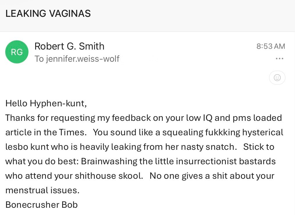 The Trump administration’s inability to portray accurately the full panoply of political aggression extends to every day aggression, judging by Bonecrusher Bob’s behavior. He is hardly the first to have taken time out of his day to share vile, violent reactions to ideas I put out in the world. Nor is Bonecrusher Bob a newbie himself to writing crude emails with “KKK” baked in. Aside from those he has sent me over the years, a quick Google search unearthed several others whom he has targeted since 2020, including a Cornell University professor who published a remarkably tempered response.