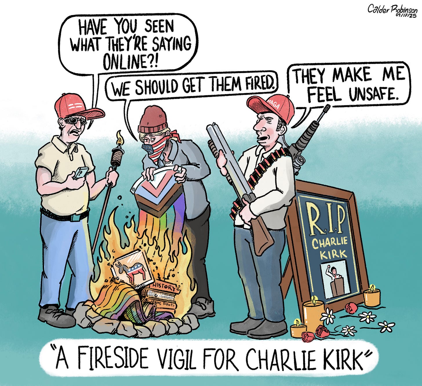 We've had a vigil for Stephen Colbert. Now we have to have one for Jimmy Kimmel. Trump is suing NY Times for $15 billion, so that's probably next. So many vigils, so little time.