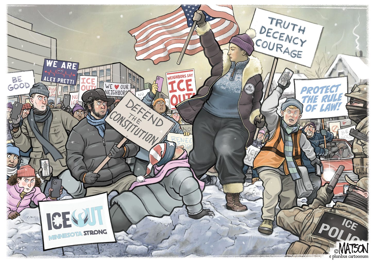 There is something fundamentally iconic in this RJ Matson cartoon. It is not at all ironic, and the figure who centers the composition is strongly evocative not only of Renee Good herself, but of the Statue she resembles.