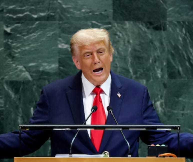 His ignorance knows no territorial bounds, as he revealed to global leaders yesterday. “President Trump’s [United Nations] speech, filled with familiar grievances and false claims, criticized the U.N. as ineffective,” the New York Times reported. He proclaimed, “I’m really good at this stuff. Your countries are going to hell.” Charming. I cannot imagine what “stuff” he is good at; surely, it’s not trade policy, cutting prices, ending the war in Ukraine or Gaza, containing the deficit, preventing a shutdown, making public the Epstein files, or following the law.