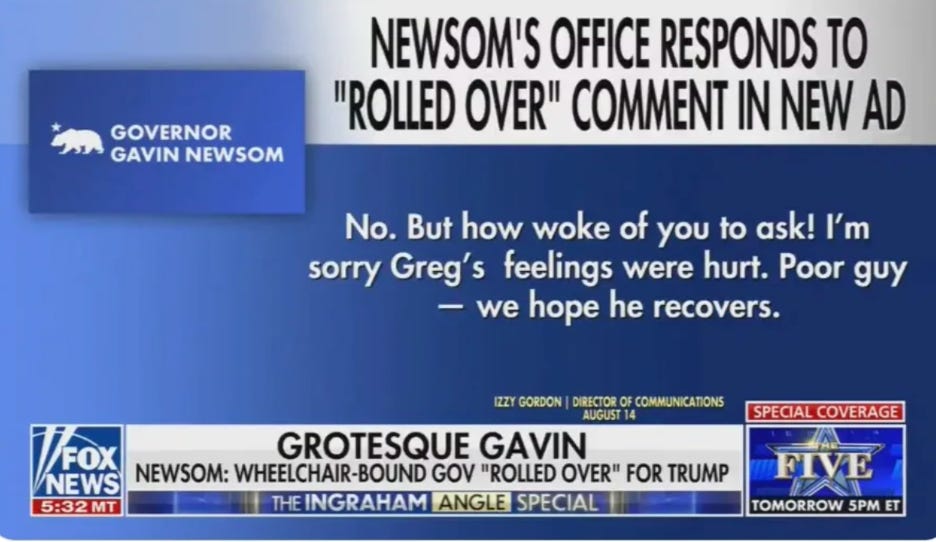 Fox News, predictably, has fumed—particularly over a jab in which Newsom accused Texas Gov. Greg Abbott of having“rolled over” to Trump’s demands, sparking outrage among conservatives who believed Newsom was mocking Abbott’s use of a wheelchair. When pressed by Fox if the insult was intentional, Newsom’s office coolly replied, “No. But how woke of you to ask!” The backlash only amplified the posts further, fueling the cycle of outrage clicks and attention.