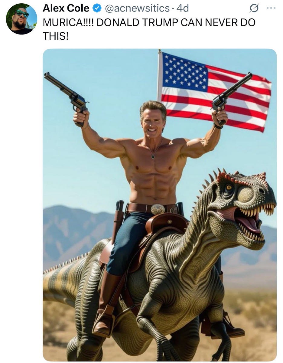 The new social strategy has energized Democrats online, inspiring supporters to churn out their own absurd AI-generated tributes to Newsom. One viral post shows him with a cartoonishly ripped physique, dual-wielding pistols while riding a velociraptor draped in an American flag—captioned, “MURICA!!!! DONALD TRUMP CAN NEVER DO THIS!”