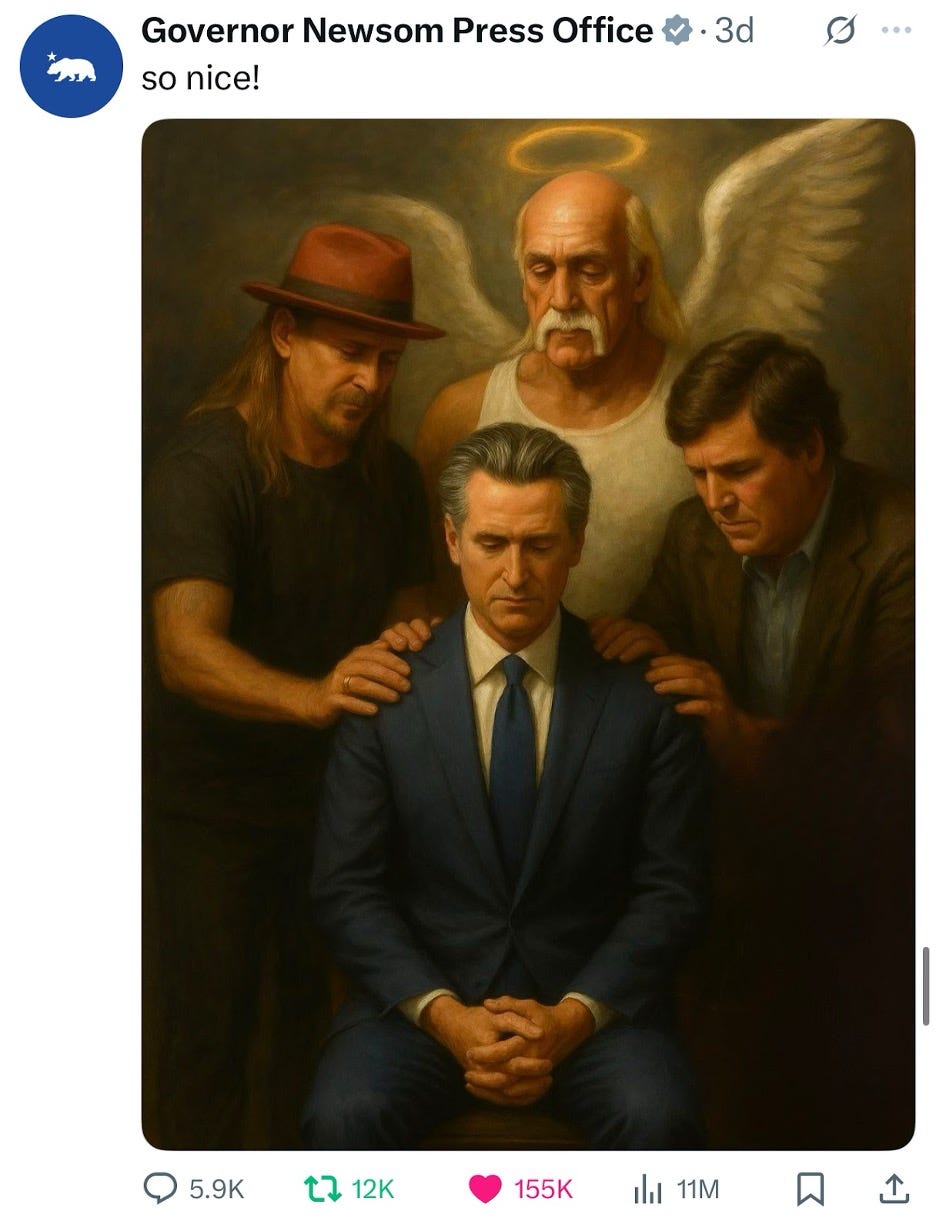 From there, the Newsom Press Office account escalated its tone, leaning into absurdity. That included an AI-generated image of Kid Rock, the late Hulk Hogan with a halo, and Tucker Carlson kneeling in prayer before Newsom, posted with a sarcastic caption. When a user called the content “blasphemous,” the account responded with a screenshot of an AI-generated image posted by the White House depicting Trump as the Pope. The response—“oops, our bad, sorry. Meant to post this-”— cleverly pointed out the hypocrisy of conservatives being outraged at Newsom while ignoring the actions of the White House.