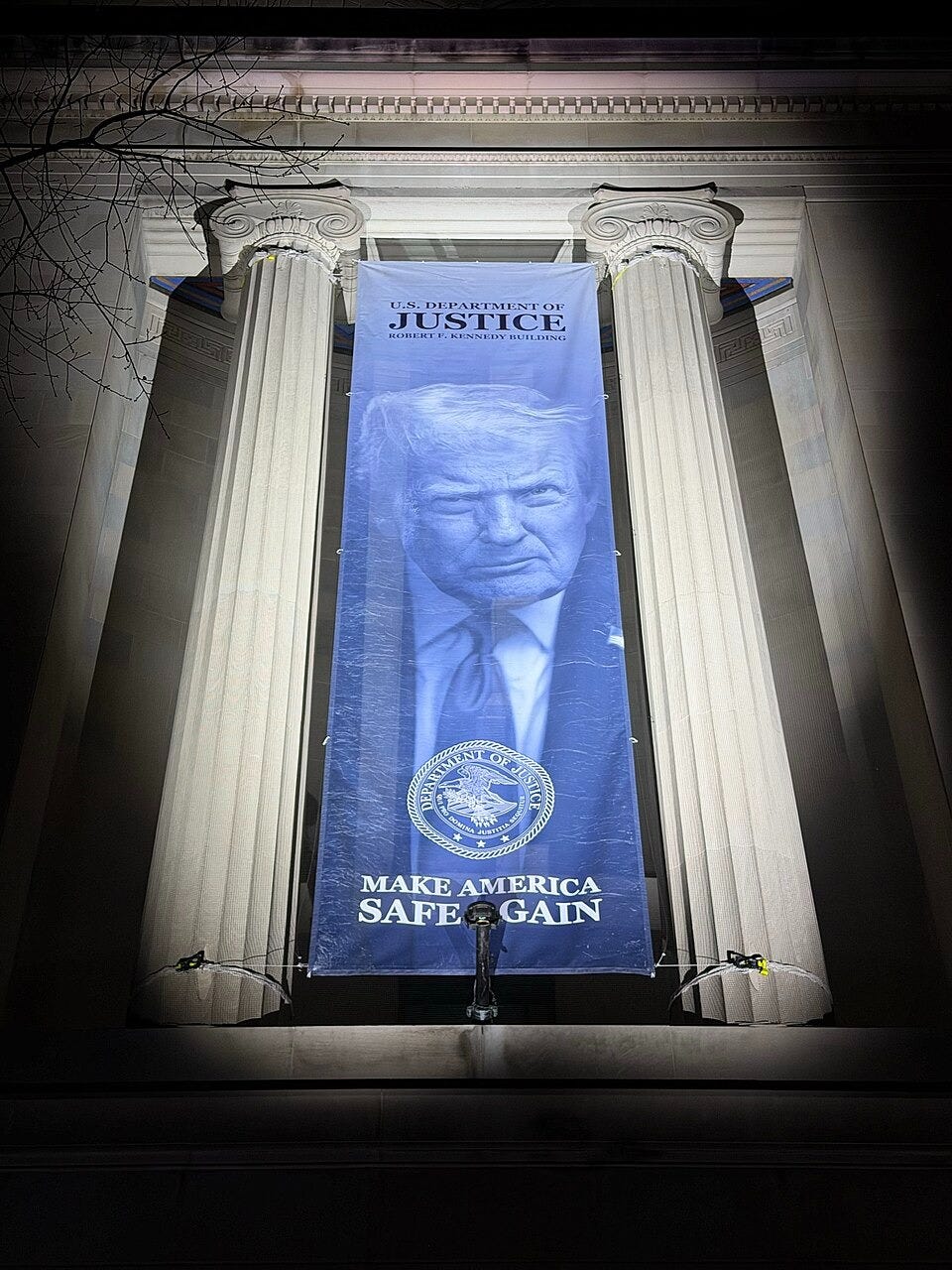 Adding to the official cult of personality around Washington, D.C., banners of Trump’s visage have been hung at the Department of Justice…
