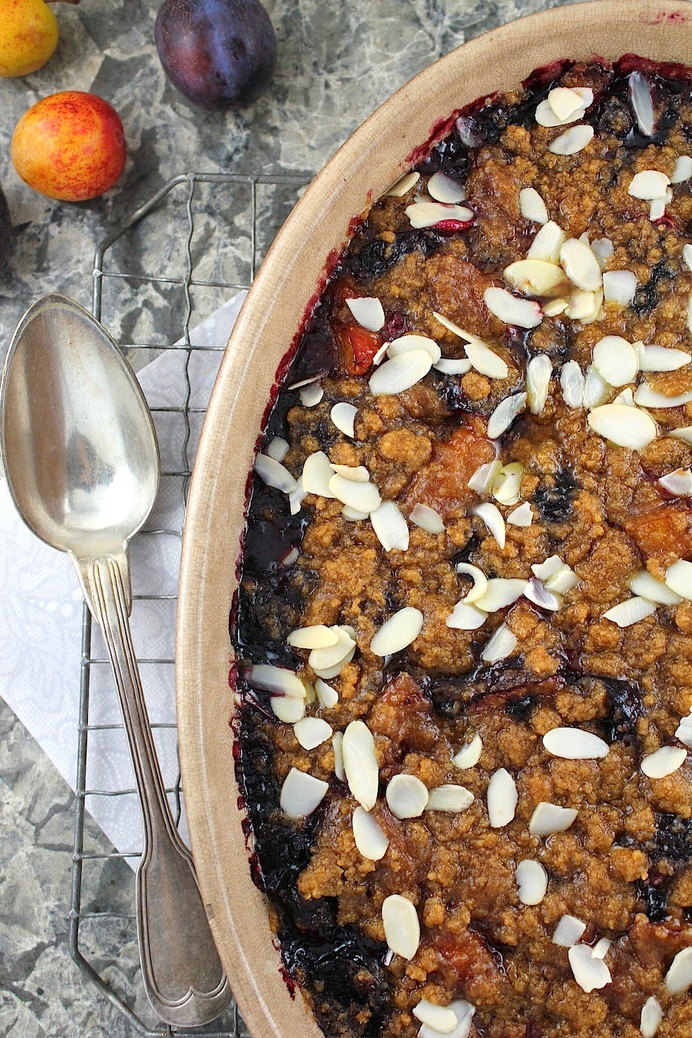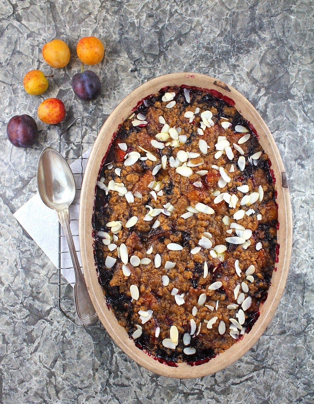 Summer-ripe plums are too marvelous to keep only for jam, so I made a 2-plum crisp, adding cherries and frozen wild blueberries for both body and depth of flavor; I find a mix of fruits better than a single fruit whether making a crisp, crumble, cobbler, or compote. I added balsamic vinegar to the fruit and topped the crisp with slivered almonds for crunch and a bit of nuttiness. It was simply out of this world.