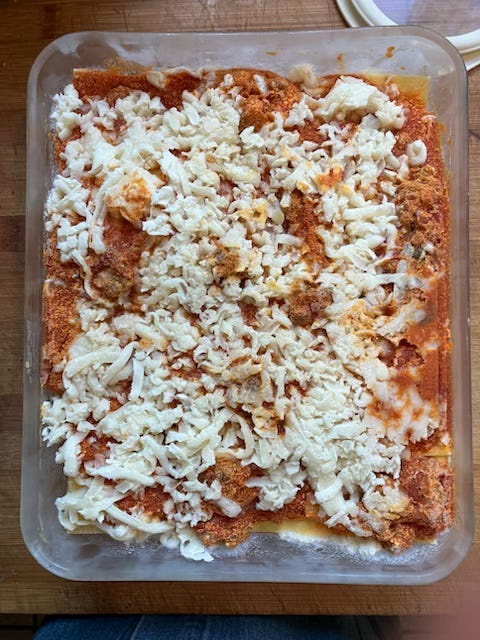 Emily gave us her labor lasagna when she was days from her own labor of love, a new baby girl. This is a dish you can make ahead and freeze for when you need to eat but don’t have the energy to cook, something she learned with the birth of her first child: “I was famished right after the baby arrived, lying feeling boneless and sweaty in bed, my mother, a midwife who had delivered the baby, and her birth team bustling around us. They say birth is a marathon, and I needed to carb load. Enter the lasagna, an afterthought, prepped last minute from leftover odds and ends in the fridge and stocked in the freezer with the rest of my stash. My friend Kristina, who had assisted at the birth, put it in the oven, and we all ate it together sitting on the big white bed while I breastfed for the first time, a reward for a job well done. This time around, it’s the only thing I’m making.”