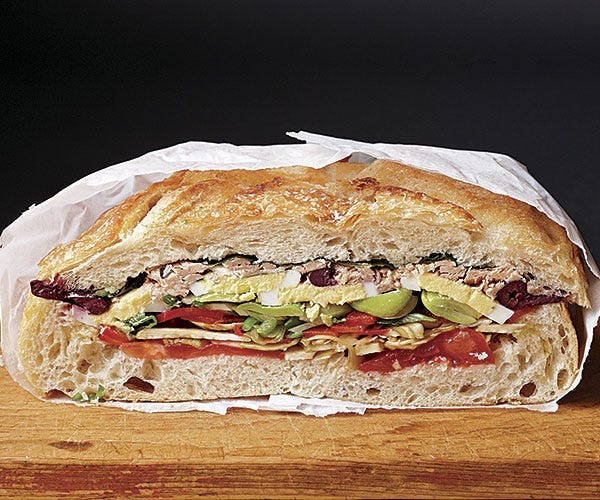 Pan bagnat, niçoise dialect for the French pain baigné or mouillé, bathed or wet bread, is the traditional sandwich version of the salade niçoise, originally a carry-along meal for fishermen or those working in the fields. A round, crusty bread roll is sliced almost but not quite through the center (leaving the two halves attached on one side, a way to catch the filling from falling out). The inside halves of the roll are rubbed with a crushed garlic clove, which is then discarded, and then the bread is “bathed” - drizzled or spooned - with olive oil, allowing the oil to soak into the bread and softening it. Slices of ripe tomato, hard-boiled eggs, thin strips of green or red bell pepper, red or spring onion or radishes are all layered into the roll. Sliced, pitted black olives and a couple of anchovy filets or some sliced or crumbled tuna are then stuffed into the bread on top of the vegetables. More olive oil is then drizzled on. Add some vinegar or the mustardy vinaigrette and a few basil leaves if you like. Then the roll is closed and pressed tightly. The Pan Bagnat is always prepared in advance to allow the ingredients to marinate, the bread to moisten, and the flavors to blend.
