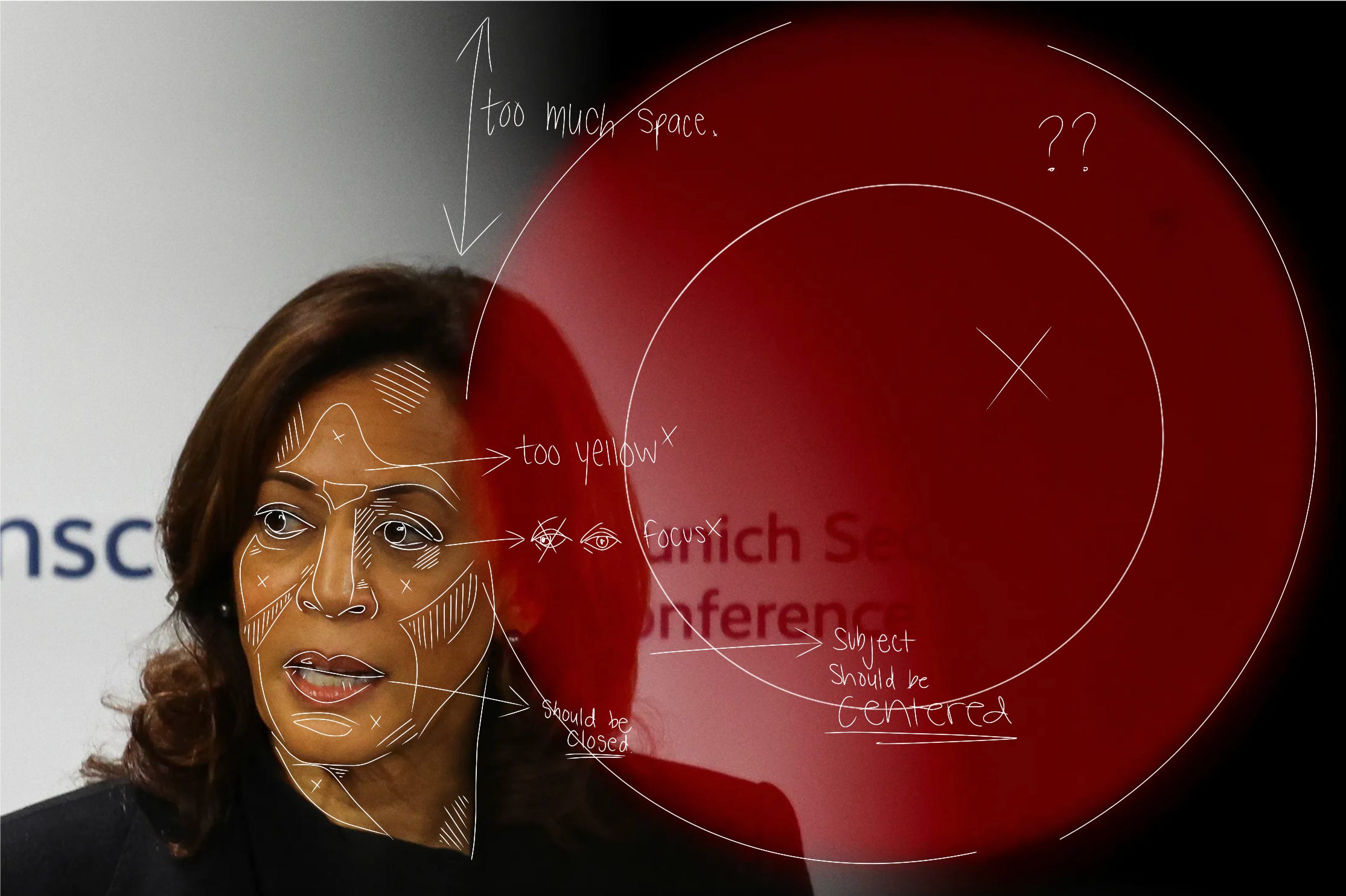 This technical oversight becomes a political one for Harris, an Indian and Black woman whose identity has been scrutinized and contested throughout her career. As I've witnessed firsthand through my lens, proper exposure and color correction for Black and brown skin requires intentional care—something photojournalism has historically struggled with. Of course, nailing the right color in a high-stakes situation like the Munich Security Conference is difficult. I was there too, and not all of my images looked perfect. But the photo editor for this story had choices: find another image that more accurately reflected her skin tone or get someone to fix it.