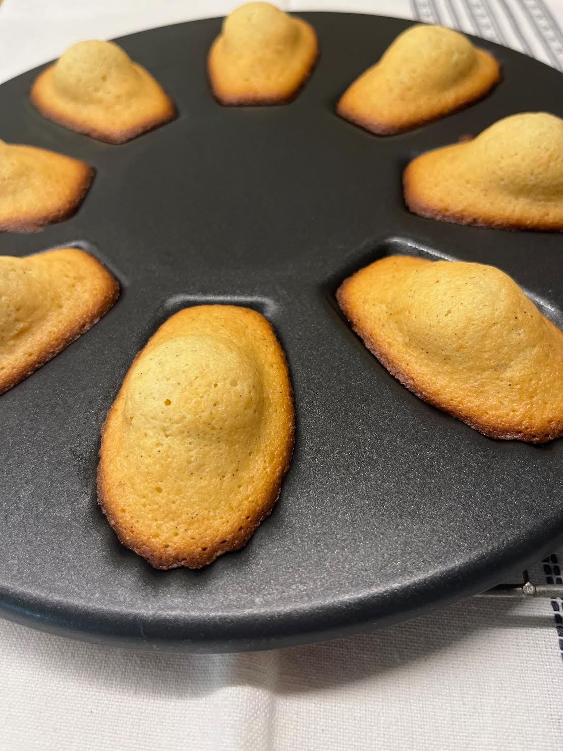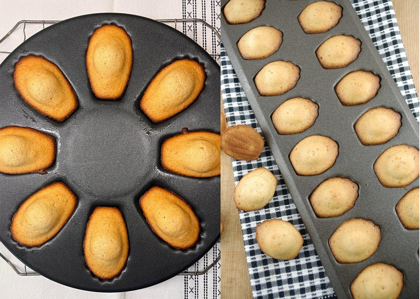 Place the madeleine pan directly on the oven rack and bake for about 8 to 10 minutes. Do not overbake the madeleines or they will be dry: take them out when puffed up and the center forms a large bump, the edges are golden but the center is still pale.