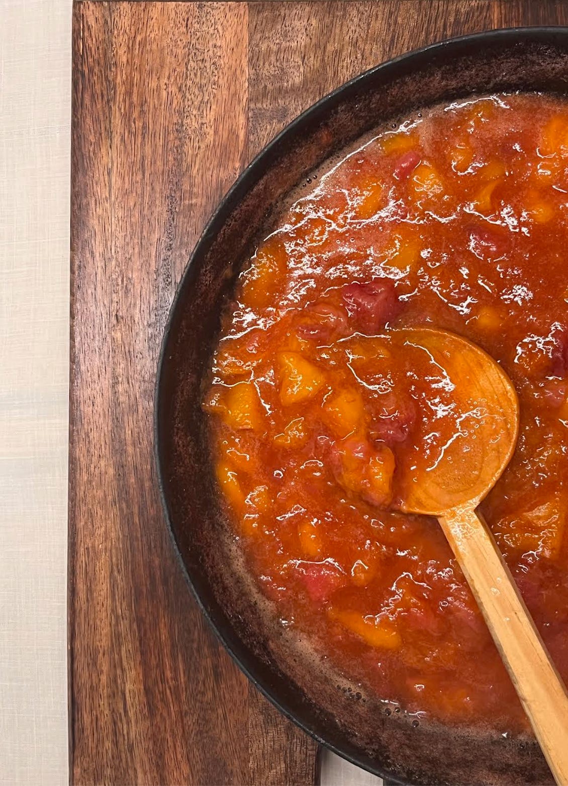 About 3.3 pounds (approximately 1.5 kilos) ripe stone fruits—a mix of yellow and/or white fleshed peaches and nectarines, apricots, and plums. I included 2 purple-red pêches de vigne or vineyard peaches