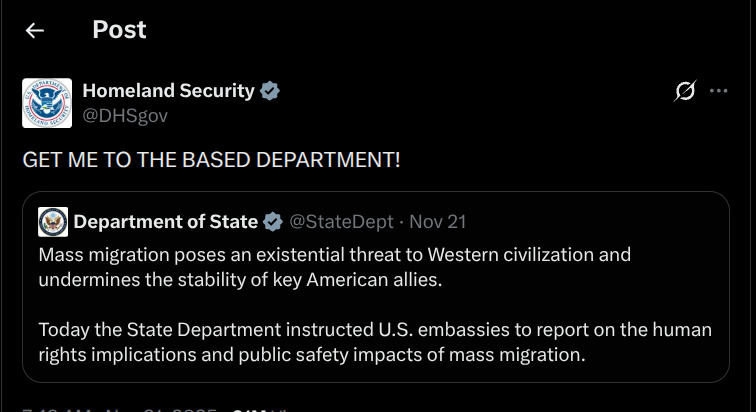 The State Department wrote an X post in November that could have been ripped from a white nationalist pamphlet: “Mass migration poses an existential threat to Western civilization and undermines the stability of key American allies.” The post suggested that migration is a threat to “human rights” — disregarding the rights of asylum seekers under international law. The Department of Homeland Security retweeted the message with high praise for its sister cabinet agency, re-branding State as the “BASED DEPARTMENT!”