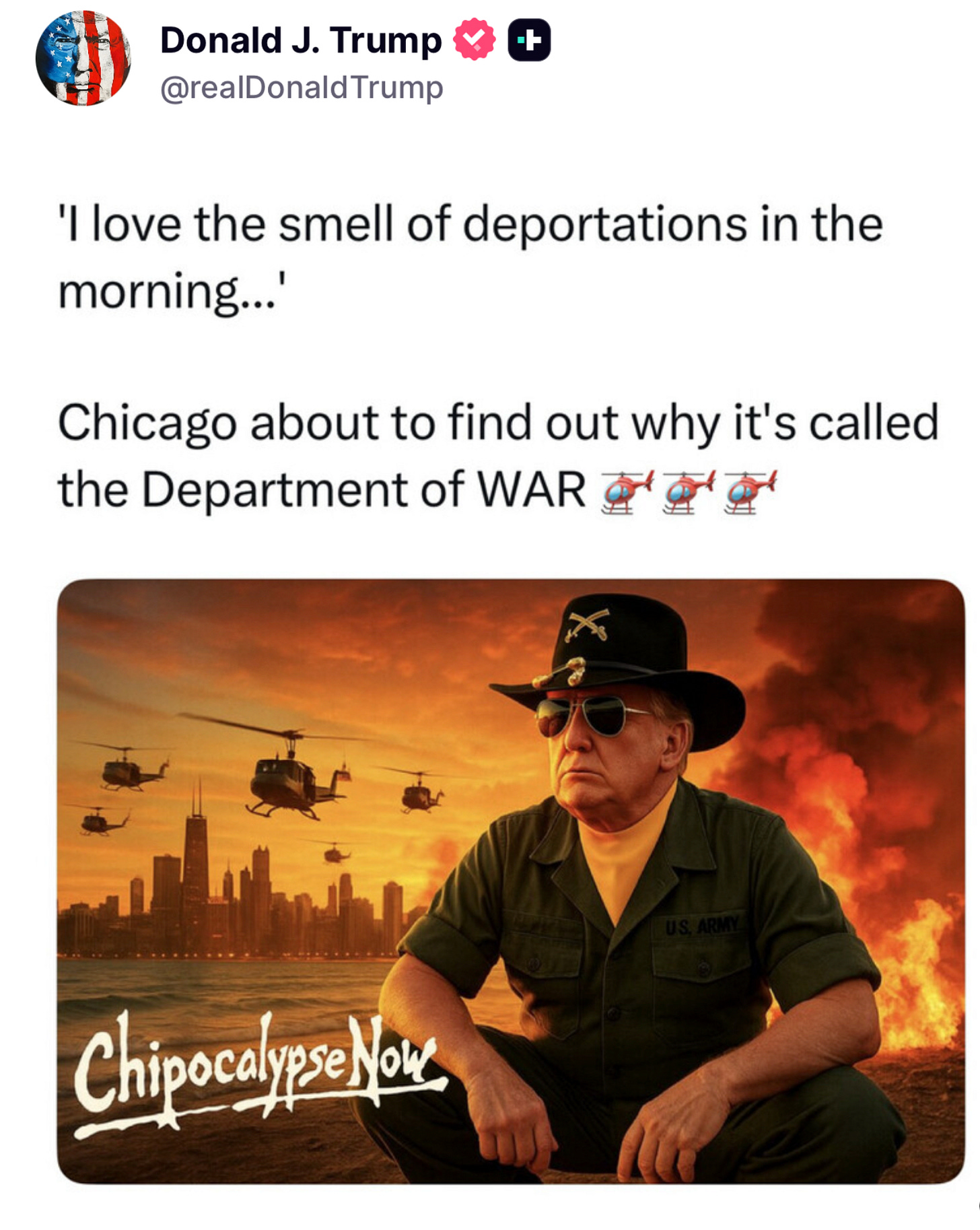 As the administration’s anti-immigrant offensive geared up in Illinois in September, Trump posted a mock movie poster titled Chipocalypse Now to his Truth Social account. Referencing Francis Ford Coppola’s Vietnam epic, the poster renders Trump crouched in the manner of Robert Duval’s iconic character. The president added the caption: ‘I love the smell of deportations in the morning…’ and menaced that Chicago was about to “find out why it’s called the Department of WAR 🚁🚁🚁”