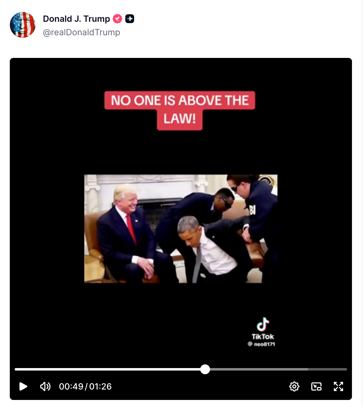 Trump never gives up a grudge. In July, the president posted an AI video to his Truth Social account titled “No One Is Above the Law!” But rather than a defense of law and order, the video was a dark revenge fantasy, depicting former president Barack Obama being roughly handcuffed by FBI agents inside the Oval Office as Trump looks on, laughing — all set to the strains of the Village People’s “YMCA.”