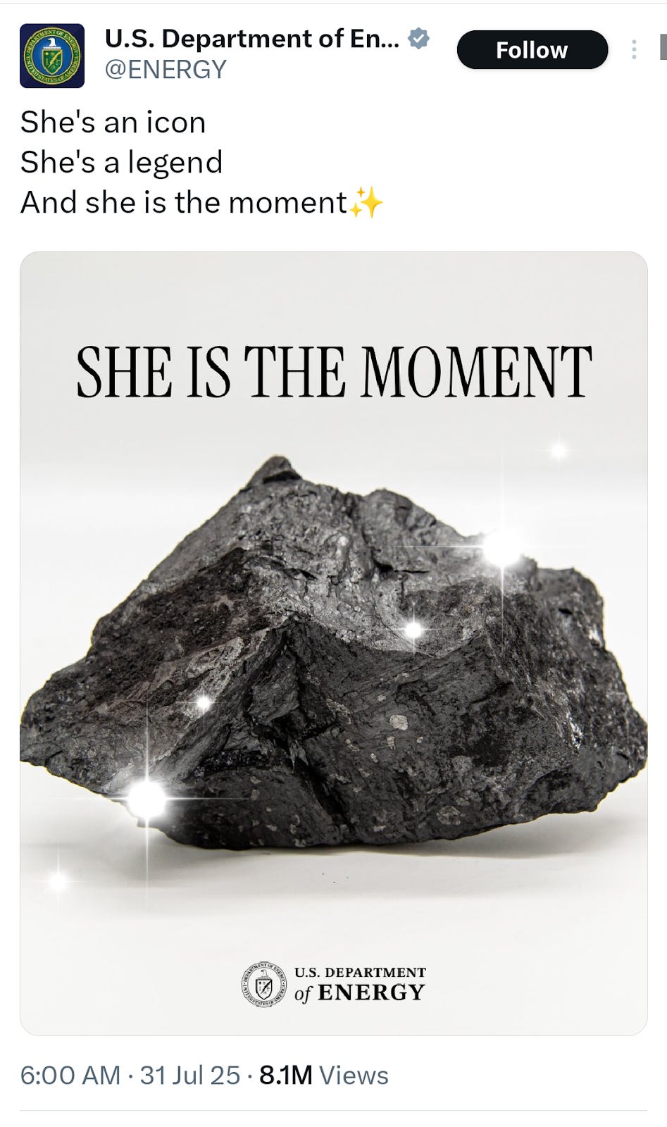 Even the designed-to-be-dull agencies of the Trump government have joined in trolling the American public. The Department of Energy — currently promoting a retrograde reliance on fossil fuels that Trump calls Energy Dominance — decided to hype coal as if it were a pop diva.