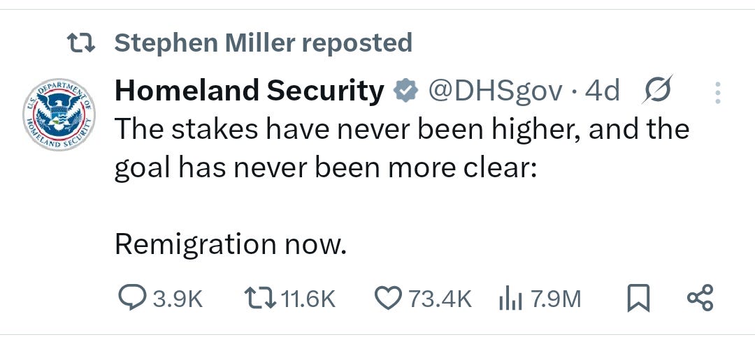 The administration’s flirtation with white nationalism was never more explicit than when the Department of Homeland Security put out a call for “Remigration.” That obscure term is a battlecry for the European extremist-right, for whom “remigration” is a demand for the mass expulsion of nonwhites. “The stakes have never been higher, and the goal has never been more clear,” DHS wrote. This post had approval up the chain of command; it was retweeted by Trump’s xenophobic White House deputy, Stephen Miller.