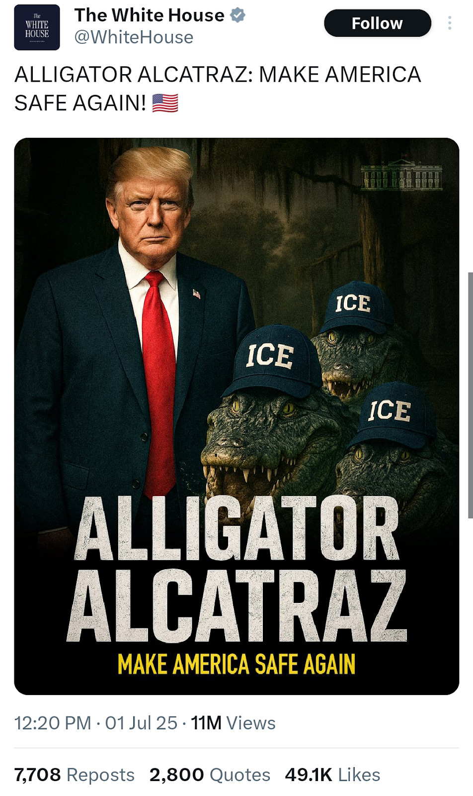 The detention facility is no joke. Amnesty International has decried the “inhumane conditions” as “unbearable,” citing “overcrowded cages,” “maggot-infested food,” and a lack of adequate communication with attorneys. But this cruelty-is-the-point White House touted Alligator Alcatraz as a model to: “Make America Safe Again! 🇺🇲.”