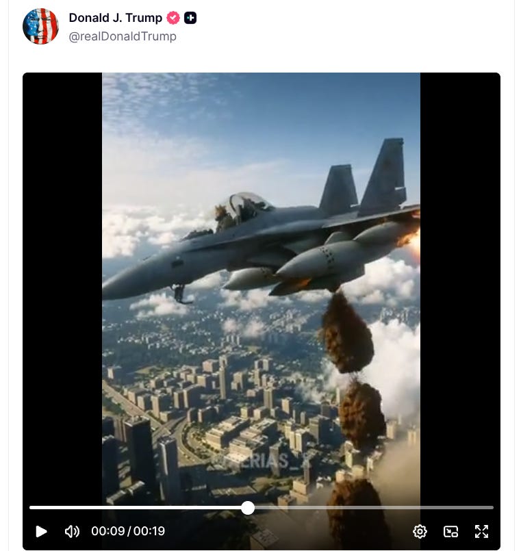 Infamous for his thin skin, Trump got triggered by the massive No Kings 2 protests — which brought 7 million Americans out to the streets in October. He responded like a mature adult: by posting an AI video to Truth Social depicting himself, outfitted in a crown, flying a fighter jet labeled “King Trump,” which proceeded to drop a payload of excrement on to protesters below. To imagine that president George W. Bush once sparked controversy by dismissing anti-war protesters as a “focus group.” How quaint.