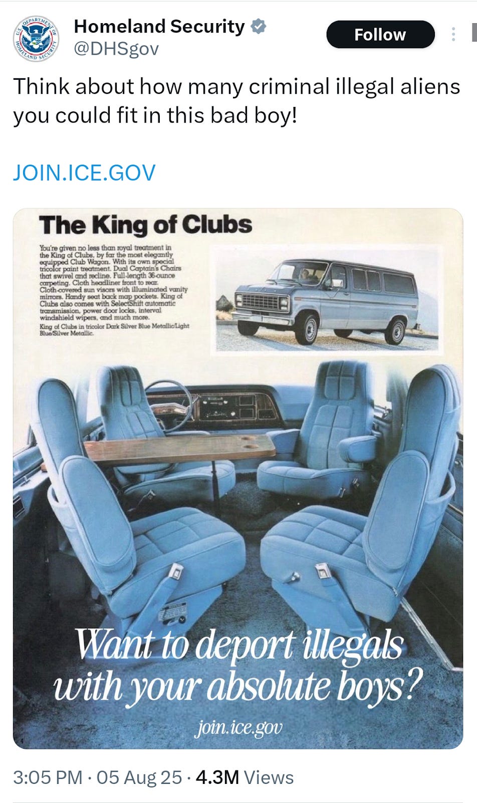 At a time when federal authorities are routinely rounding up migrants into unmarked vans, DHS sought to recruit ICE agents with a 1980s A-Team aesthetic. One post featured a tweaked advertisement for a Ford conversion van with four captain chairs. It solicited would-be agents with promises of a bigoted brotherhood: “Want to deport illegals with your absolute boys?” DHS added the caption: “Think about how many criminal illegal aliens could fit in this bad boy!”