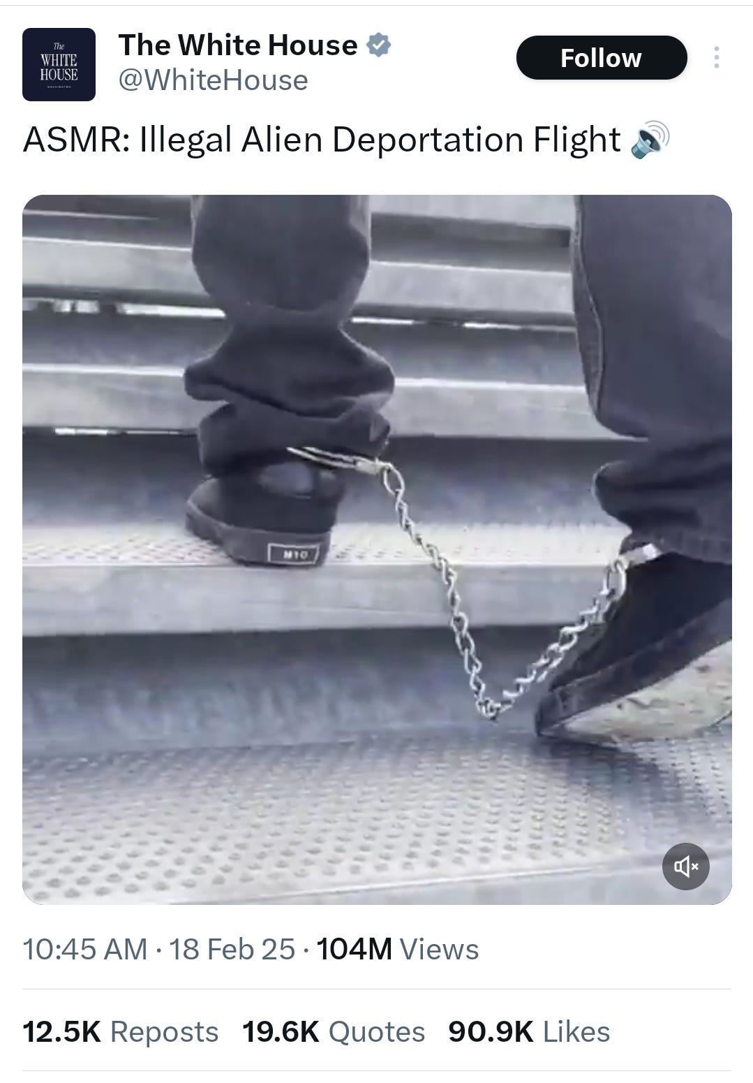Trump’s social media team abandoned any pretense of decency early. In mid-February the official White House X account posted a video labeled “ASMR: Illegal Alien Deportation Flight.”