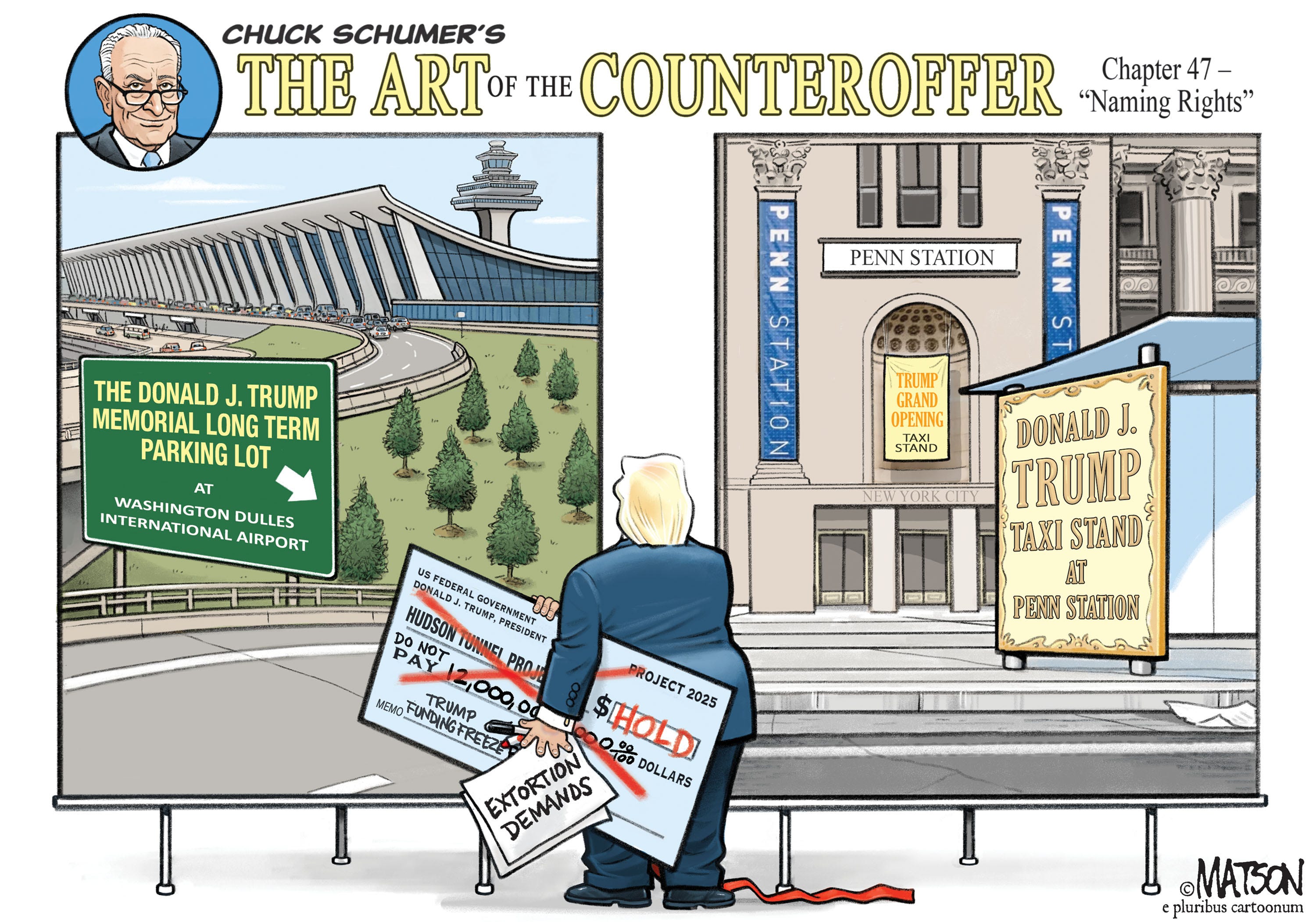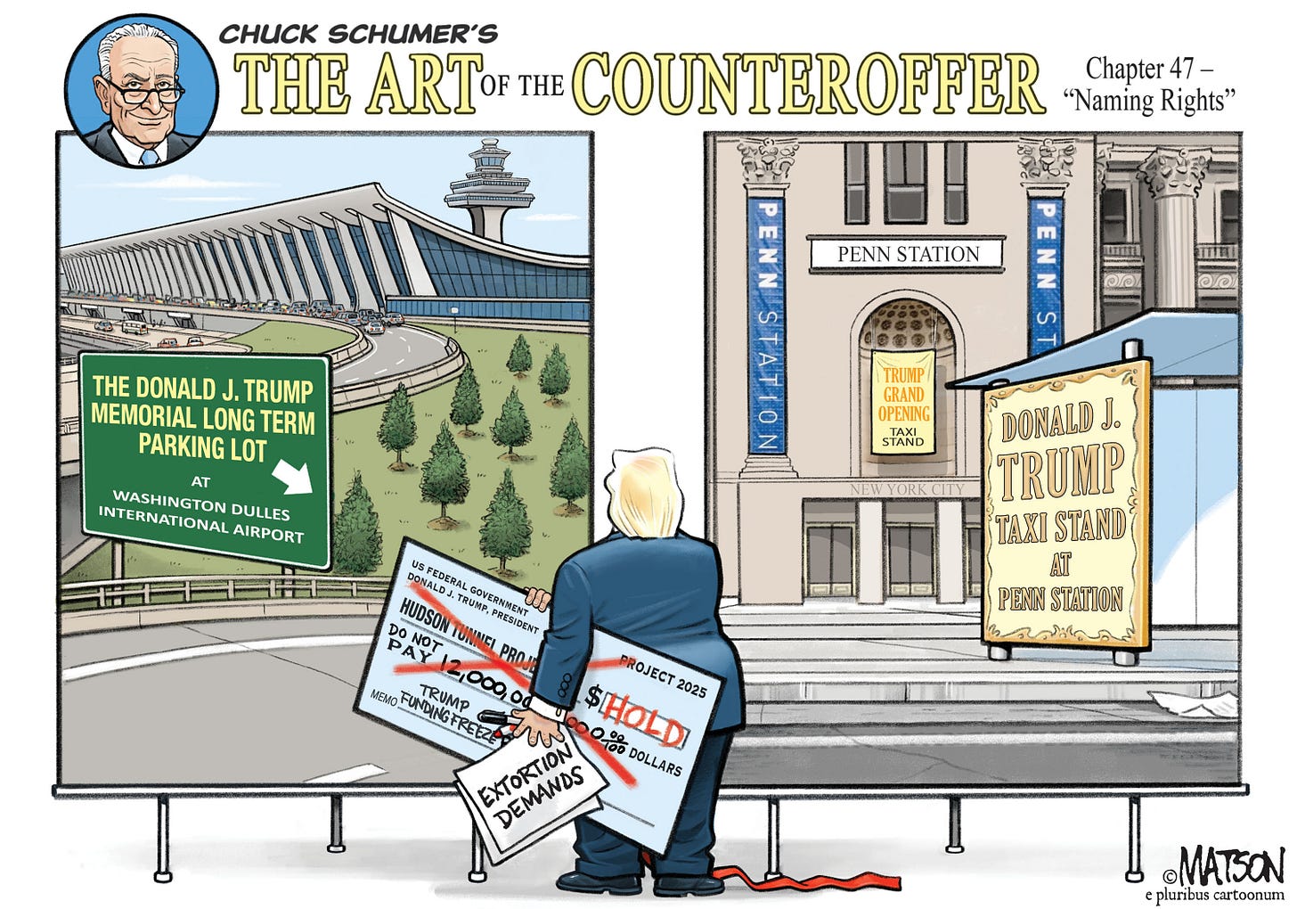 Another fantastic, biting cartoon, depicting the ridiculousness of Trump. Poor Chuck Schumer ... he is trying but, I fear, will never quite "get" that this is not the Republican Party that he once got along with, and bargained with successfully. A better name for the Republican Party might be "The Donald J. Trump Do-What-He-Says Party," or the "Elephant Sycophant Party." There has got to be a better label, that befits what is going on. Maybe the "Red Scare Party," or more precisely "The Fascist Enthusiasts."