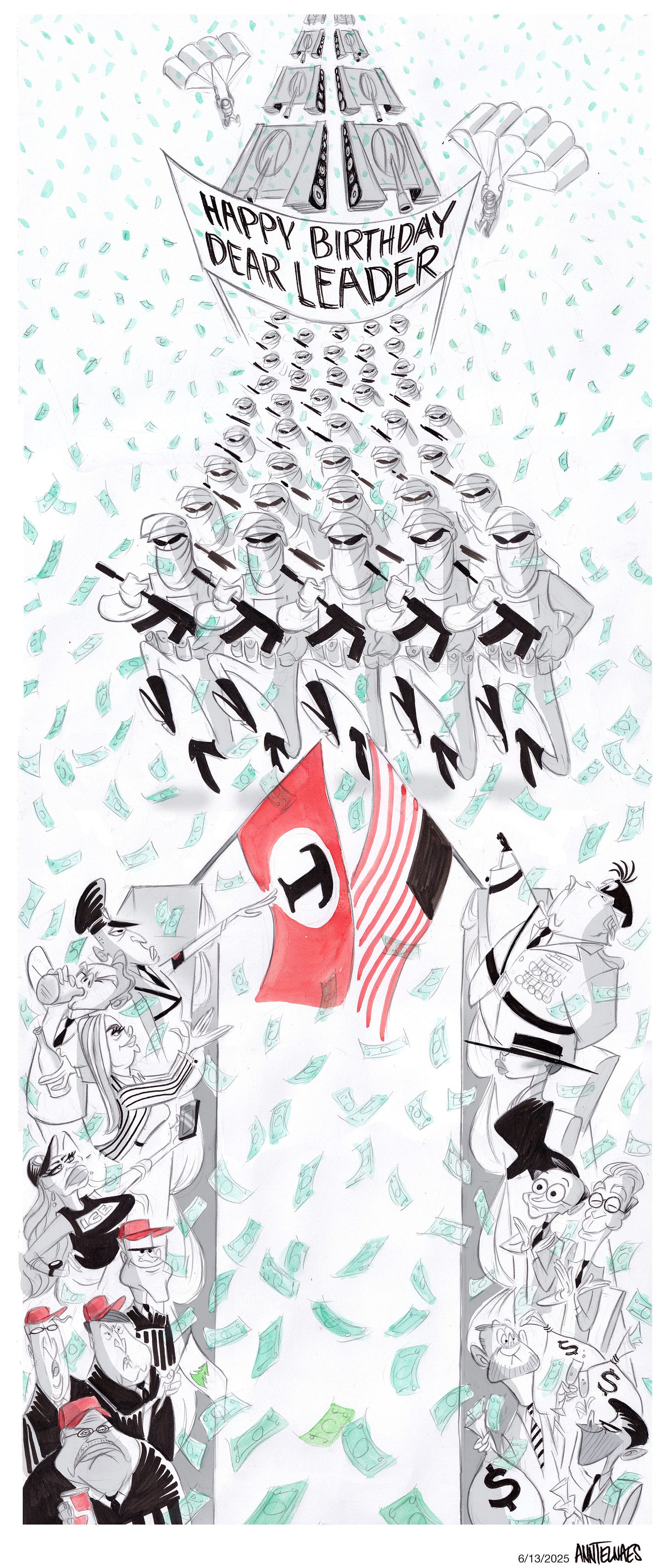 In the distance a line of tanks, two by two, parachuters on each side, then comes the goose-stepping masked military carrying their swastimachineguns, saluted Nazi style by the obese king with the tiny gloved hand on one side, and his immigrant hating political advisor on the other, the botoxed rarely seen queen standing next to the obese obscene king. Who else is in the stands? Well there’s the wide eyed speaker, and the treasury sec, Uday and Kusay holding bags of ill gotten gains. And there’s the North Korean wannabe press secretary, Whiskey Pete, the security woman with ice on her breasts, and a gaggle of red hatted sour faced buffoons. All showered with floating bills. All to our great shame and detriment. Wonderful cartoon perfectly capturing the moment perfectly.