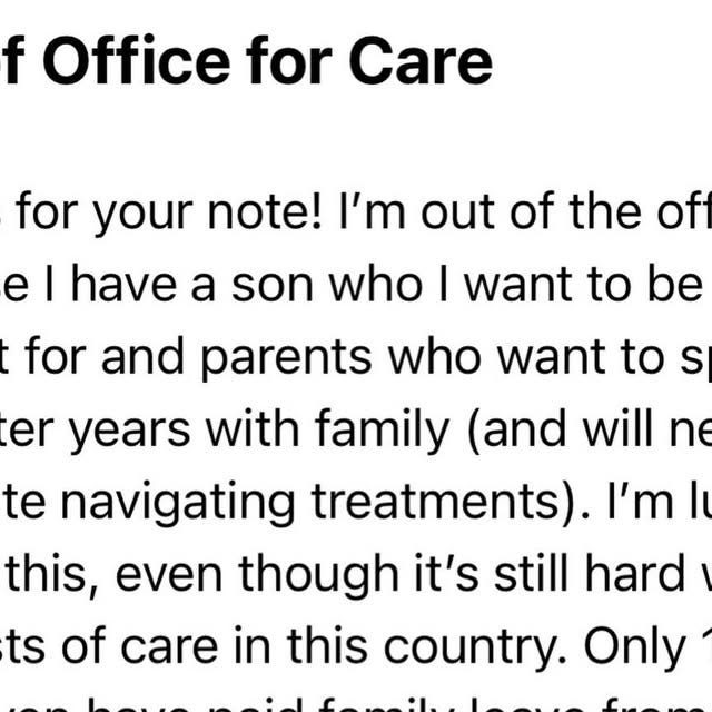 Workers from all industries—artists to lawyers, nonprofit leaders to small-business owners— have been giving the country an unfiltered look at why they step away from work and what it costs to do so without paid leave. As I wrote for Ms. magazine, “People across the country are setting their out-of-office messages and finally saying the quiet part out loud: they’re stepping away to care,” said Dawn Huckelbridge, founding director of Paid Leave for All. “They’re sharing these messages publicly to make plain the caregiving that shapes our lives. While many of these messages have some humor, they remind us that care is the backbone of this country, and that it’s past time the U.S. passed paid leave. Too many of us don’t have an ‘out of office,’ or any paid time to care.”