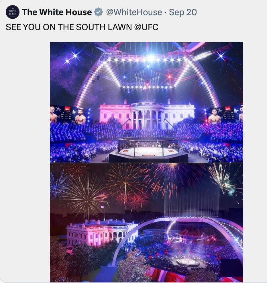 I know…there are hundreds of more urgent matters threatening America’s citizens and institutions than a televised White House MMA fight. Reopening the government; more organized, less hateful immigration policy; healthcare and energy reform, to name a minimum. But it is still worth considering (if only to steel ourselves) the lasting stain that would be created by celebrating America’s 250th anniversary with a corporatized MMA fight held at our nation’s most iconic building—one also known as “the People’s House.”