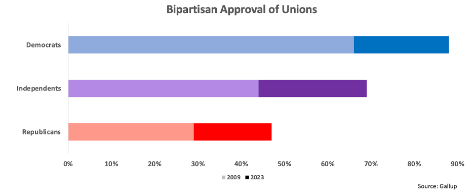 Americans increasingly understand all of this, even if many elite opinion leaders don’t. For all the talk about how we need to restore public trust in institutions, we ignore that unions are the one institution to have gained public trust since 2008—and across partisan lines. This isn't because of PR campaigns; it's because people have witnessed concrete victories by unions such as the UAW, WGA, and SAG-AFTRA, demonstrating that collective action can still succeed against powerful interests.