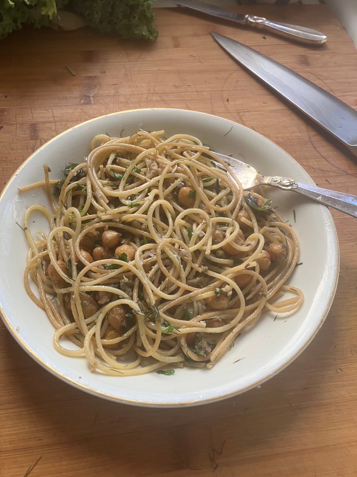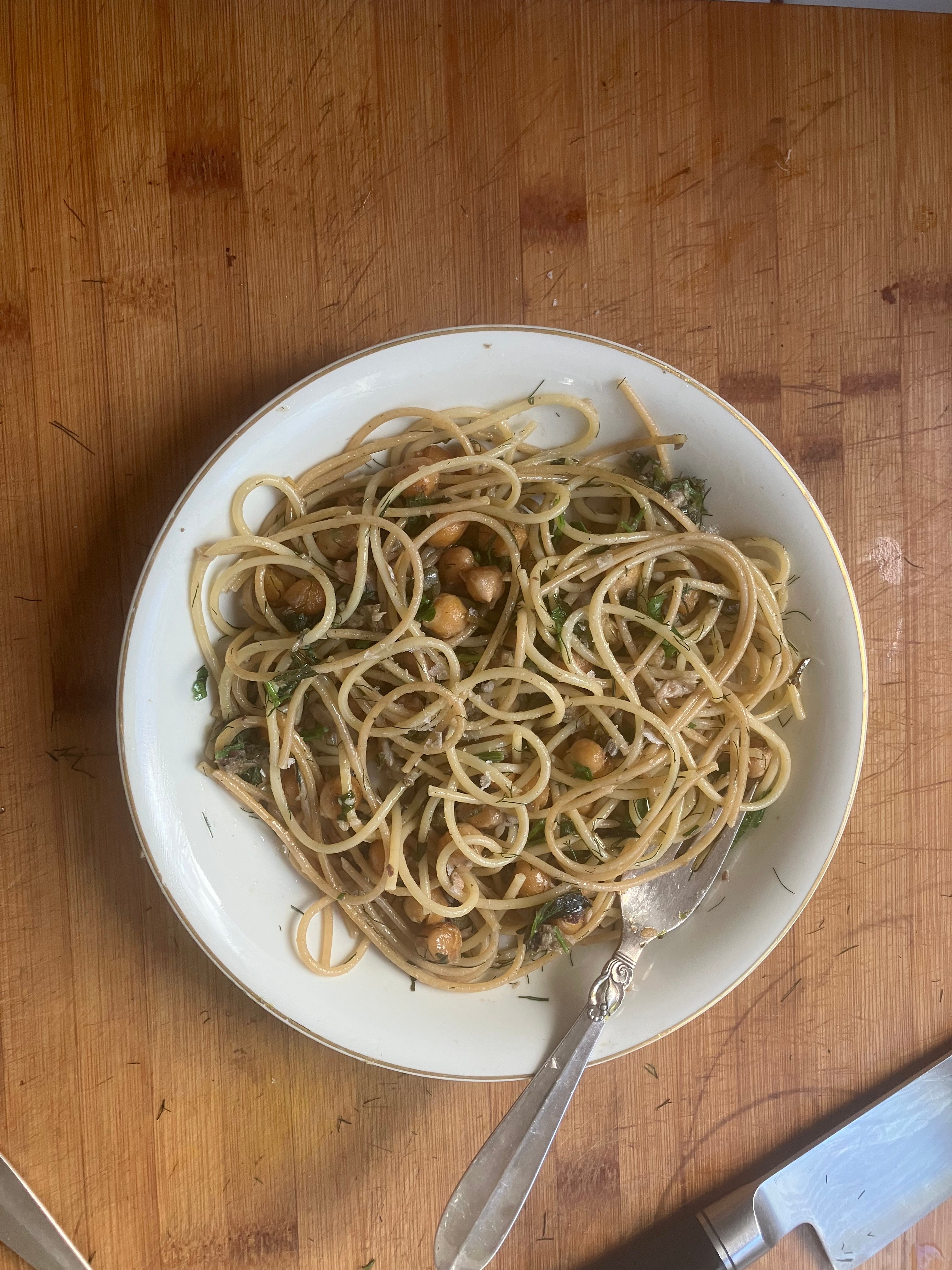 I love a good pantry pasta because it’s infinitely flexible. Feeding vegetarians? Double the chickpeas, leave out the tinned fish. Grocery bills too high? Scavenge some dandelion greens instead of buying herbs. Got gluten-free folks around the table? Well, that one’s a little trickier, but these days they’re doing impressive things with rice and lentil pastas.