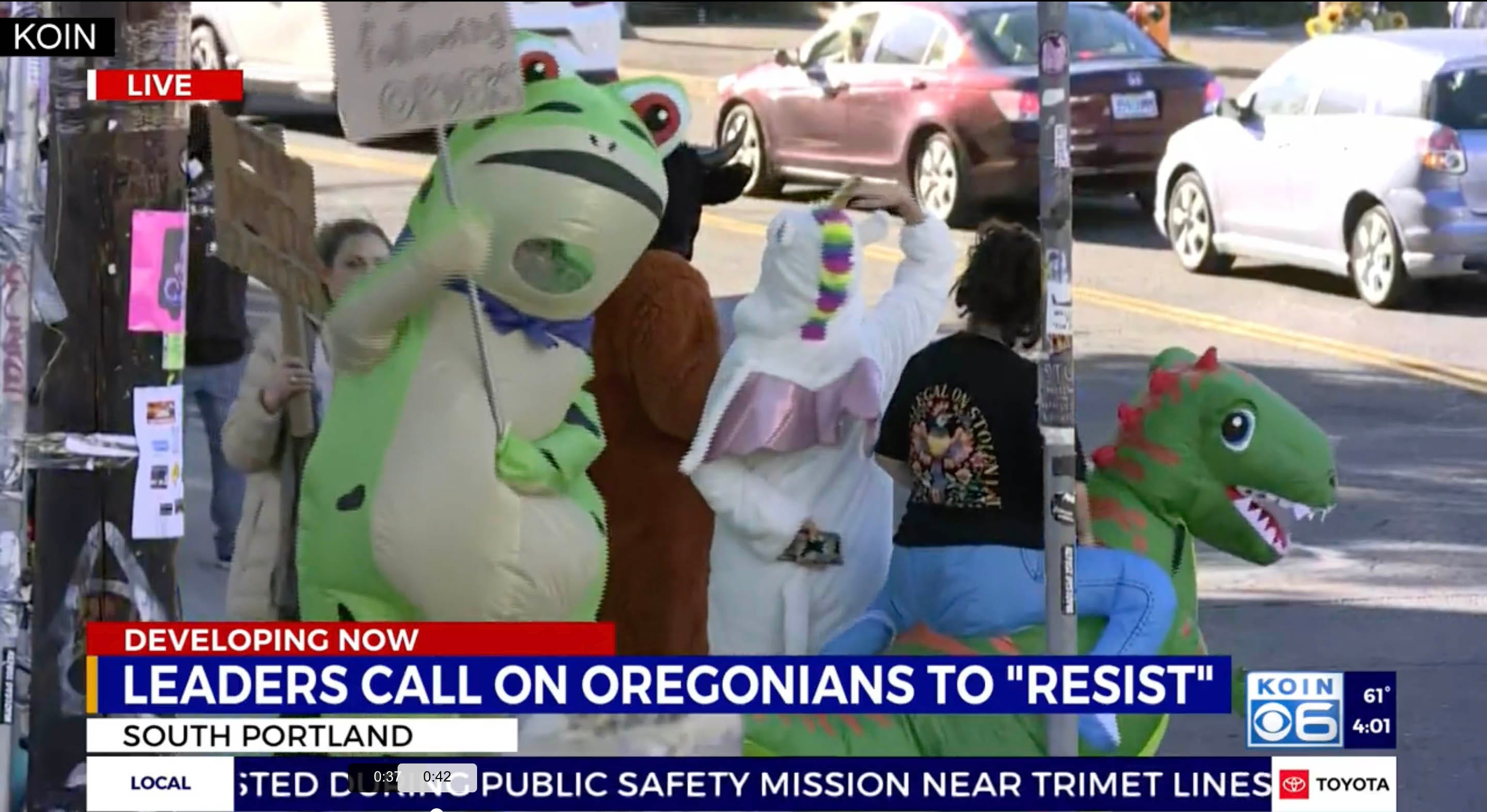 As Doddering Donnie drones on about the war zone that is Portland, Ore.—at this point I’m convinced someone is showing him either AI videos or videos of another city entirely—a growing group of people in inflatable animal costumes is making a mockery of Trump’s lies and the cosplaying goons at the city’s Immigration and Customs Enforcement facility.
