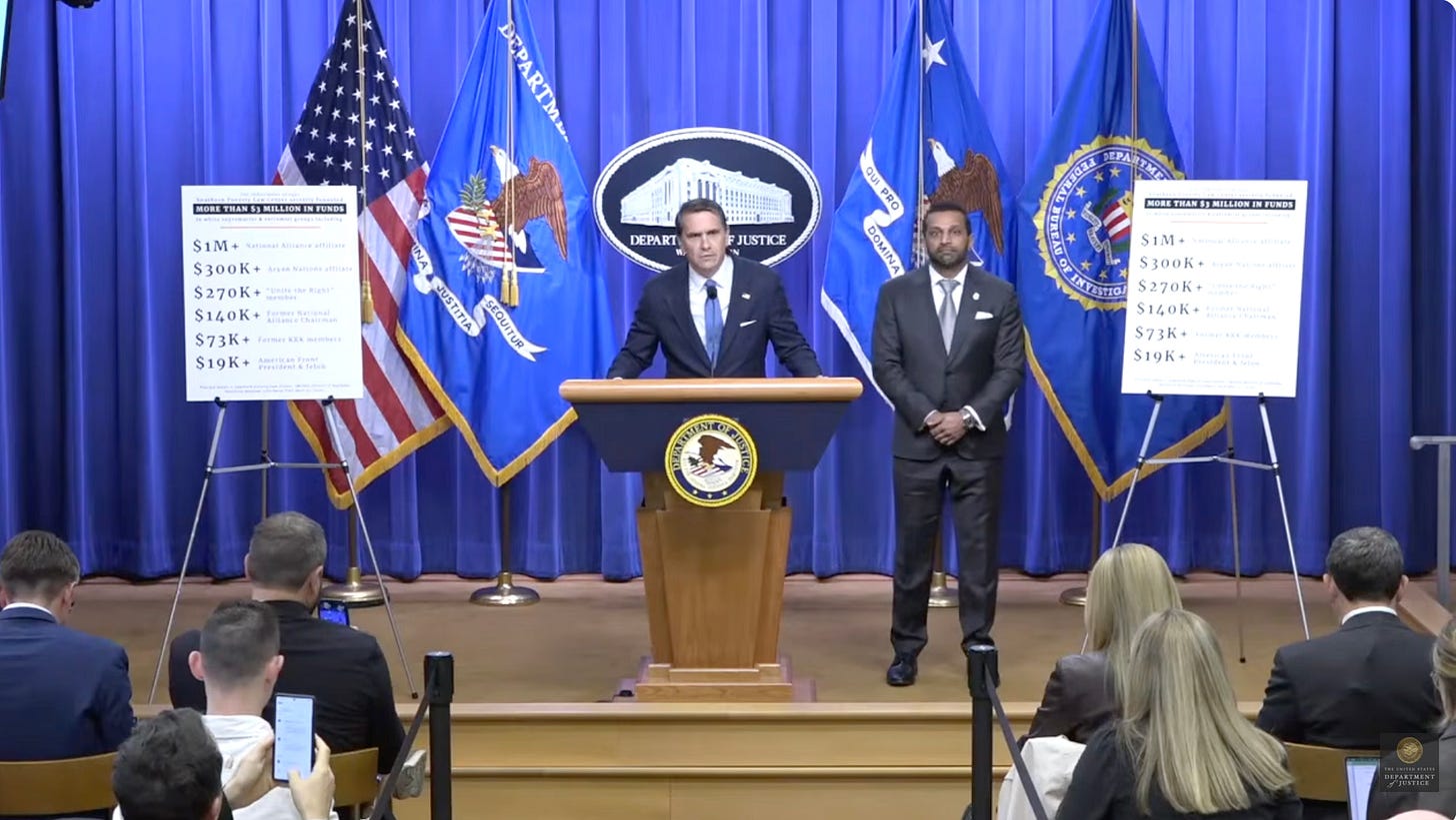 During a press conference on Tuesday, Acting Attorney General Todd Blanche and FBI Director Kash Patel announced that the SPLC had been criminally indicted by a grand jury in Montgomery, Alabama. “There is nothing political about this indictment,” Blanche insisted. Anyone paying attention knows that is a lie. This DOJ attack on the esteemed SPLC is a travesty.