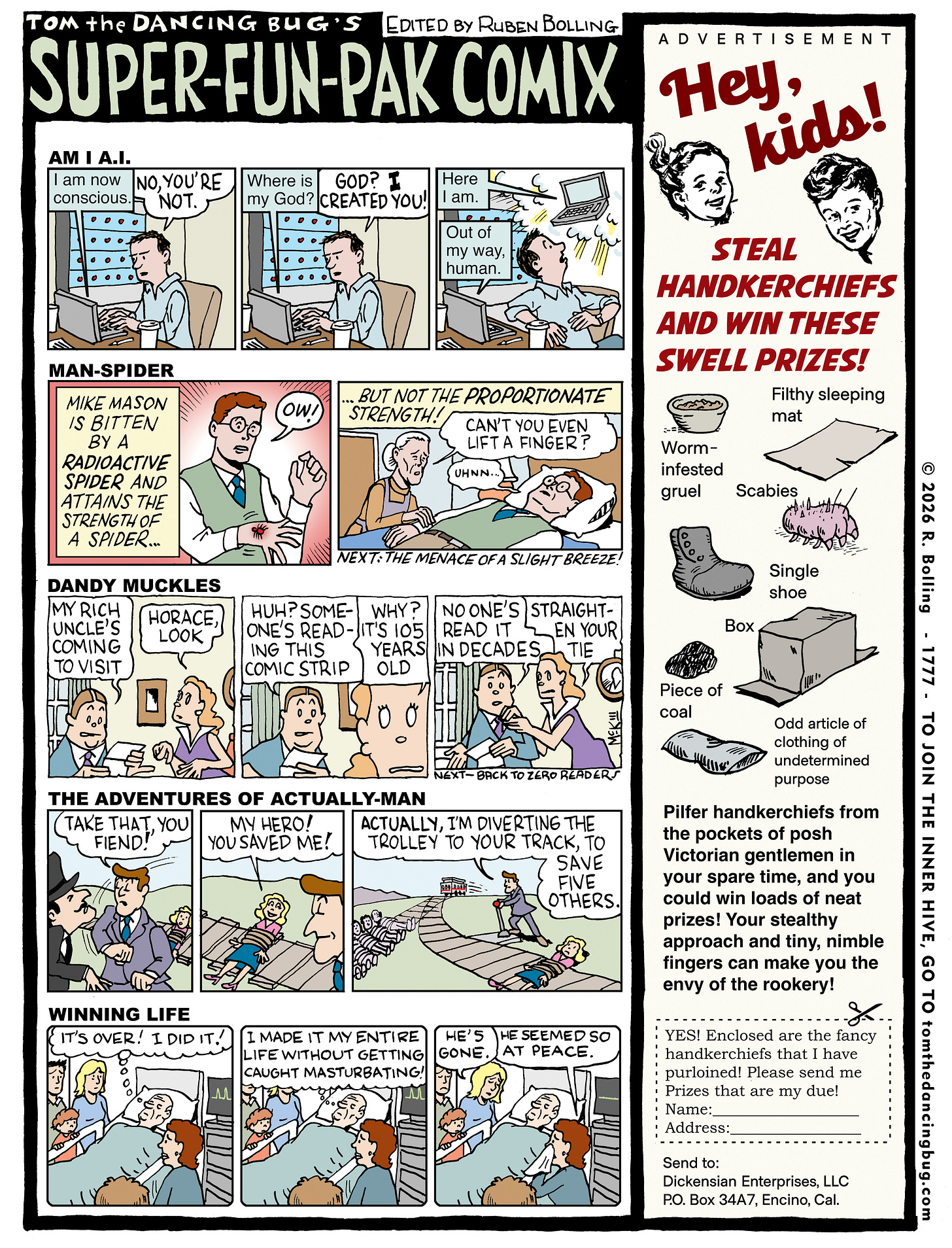 Follow Ruben Bolling on Substack; join Tom the Dancing Bug’s Inner Hive subscription club; and please visit the Tom the Dancing Bug website, with information about The Complete Tom the Dancing Bug collection of books.