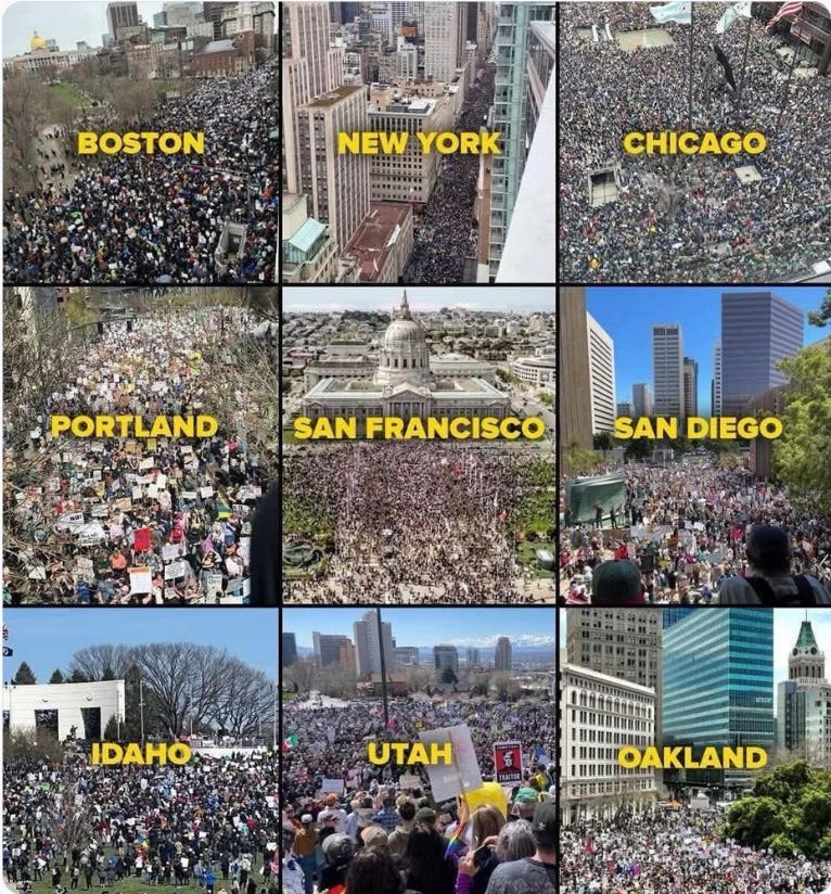 Yesterday’s split screen was striking: millions of peaceful high-energy protestors on one side and Trump’s listless North Korean-style self-celebration on the other. No Kings featured throngs of marchers of every age. Well over five million people participated in demonstrations in all 50 states across the country (plus multiple global protests occurring in solidarity, in cities like Frankfurt, Paris, and Toronto. There were countless original signs (“No ‘faux king’ dictators” was seen from coast to coast), singing, chanting, and even dancing, attended by seniors in walkers, babies in strollers, and—as is so important to any democracy movement—young people galore.