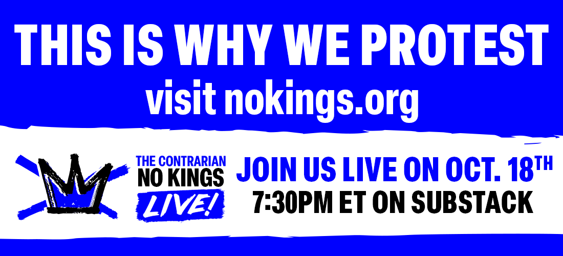 You—our Contrarian community—know that the antidotes to bullying are spine and solidarity. By turning out (and bringing family, friends, and neighbors!) at a No Kings Day event on Saturday, you can help make this the largest day of protest in American history.